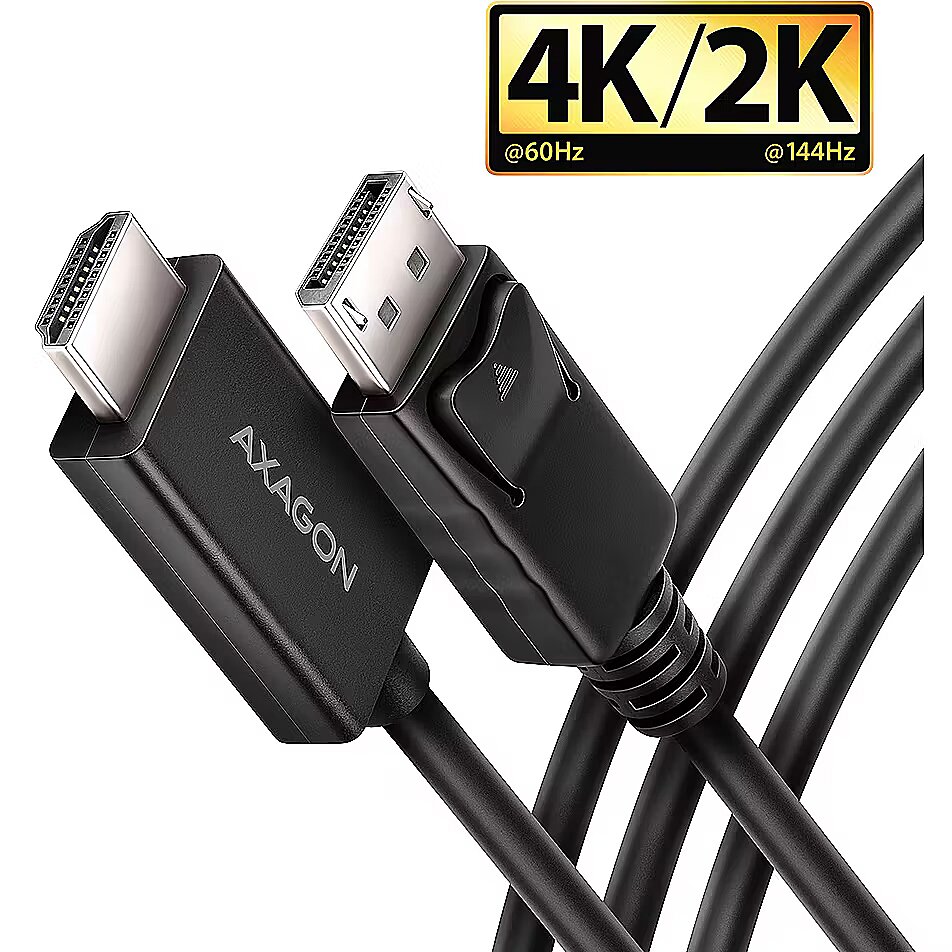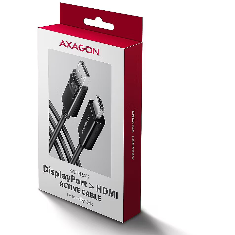 LongDesc - DisplayPort -> HDMI active cable – reduction AXAGON RVD-HI20C2 for connecting an HDMI monitor/TV/projector to a computer with a DisplayPort output.A hardware converter with no installation required provides high-quality video output up to 4K/60 Hz Ultra HD. Popular resolutions such as 2K/144 Hz Quad HD or 1080p/240 Hz Full HD are also supported. Thanks to HDR (high dynamic range) support, you can enjoy a significantly expanded range of colours and contrasts without restrictions.The Plug and Play technology, makes it ideal not only for professionals but also for home users who want to easily and efficiently expand their multimedia setup.Enjoy a home cinema experience with stunning 4K visuals, or use the adapter for conferences and presentations. It’s perfect for schools and interactive spaces where computers are frequently connected to HDMI devices. Graphic designers and video creators will appreciate the detailed display. The adapter is compatible with monitors from brands such as Dell, HP, Lenovo, ASUS, Samsung, LG, Sony, MSI, and others, ensuring its versatility and reliability.Thanks to HDCP 2.3 support, you can enjoy your favourite streaming services in 4K resolution without restrictions, including Netflix, Disney+, HBO Max, Amazon Prime, and Apple TV+. It also supports lossless audio transmission, best enjoyed on modern TVs. HDCP support must be enabled on all connected devices as well as by the streaming service itself.The video cable is made of high-quality materials, ensuring excellent reliability. The DP connector features safety latches that prevent accidental disconnection. The cable and connectors are protected against bending and breakage. With its 1.8 m length, the adapter ensures a reliable connection even to more distant monitors or projectors.The cable is unidirectional, i.e., it functions as a DisplayPort to HDMI converter, not the other way around.Input (connection to computer):• DisplayPort v1.4• DP connector with latch (M) male• Connector latch control buttonOutput (connection to monitor / TV / projector):• HDMI v2.0b• HDMI A (M) male connectorThe most widely supported resolutions:• 4K/60, 30 Hz Ultra HD• 2K/144, 120, 100, 60 Hz Quad HD• 1080p/240, 144, 120, 100, 75, 60 Hz FullHD Other supported resolutions:The resolution and refresh rate depend on the monitor and graphics card used.• max. 4096 x 2160 (17:9) @60Hz DCI 4K• 3840 x 2160 (16:9) @60Hz UHD-1 4K (UHDTV)• 3840 x 1600 (21:9) UW 4K (Ultrawide 1600p)• 3840 x 1200 (32:10) 4K (Super ultrawide 1200p)• 3840 x 1080 (32:9) 4K (Super ultrawide 1080p)• 3440 x 1440 (21:9) UWQHD (Ultrawide 1440p)• 2560 x 2048 (5:4) QSXGA• 2560 x 1920 (4:3)• 2560 x 1600 (16:10) WQXGA• 2560 x 1440 (16:9) @144Hz QHD• 2560 x 1080 (21:9) UWFHD (Ultrawide 1080p)• 2048 x 1536 (4:3) QXGA• 2048 x 1152 (16:9) QWXGA• 1920 x 1440 (4:3)• 1920 x 1200 (16:10) WUXGA• 1920 x 1080 (16:9) @240Hz FullHD/1080p • 1856 x 1392 (4:3)• 1792 x 1344 (4:3)• 1680 x 1050 (16:10) WSXGA+• 1600 x 1200 (4:3) UXGA• 1600 x 900 (16:9) HD+• 1536 x 864 (16:9)• 1440 x 900 (16:10) WXGA+• 1400 x 1050 (4:3) SXGA+• 1366 x 768 (16:9) HD• 1360 x 768 (16:9) HD• 1280 x 1024 (5:4) SXGA• 1280 x 960 (4:3) SXGA-• 1280 x 800 (16:10) WXGA• 1280 x 768 (5:3) WXGA• 1280 x 720 (16:9) HD/WXGA/720p• 1280 x 600• 1152 x 864 (4:3) XGA+• 1024 x 768 (4:3) XGA• 800 x 600 (4:3) SVGAOther features:• Supports lossless transmission of up to 8-channel audio – 192kHz at 24-bit.• Supports DDC (Display Data Channel) – intelligent adjustment of resolution, frequency, and other parameters based on the source graphics chip.• Supported modes: mirroring the desktop (default setting), extension of the primary monitor area.• HDR support (High Dynamic Range, 10 bit support) - realistic reproduction of light and dark details.• HPD (Hot-Plug-Detect) support - communication sequence controlling the connection/disconnection of the device while running,• HDCP 2.3 (8K, 4K, QHD, FullHD) support- backwards compatible with HDCP 2.2 and 1.4.• Support of power saving modes with spinning down controlled by a source device (PC) and a viewing device (monitor/TV). • Power supply via bus - no external power is needed.• Dimensions 9 x 38 x 21 mm (H x B x D).• Weight 71 g (incl. cable).• Cable length 1.8 m.Supported operating systems: • All versions of Windows, macOS, Linux, Chrome OS and other operating systems.• It is a pure hardware converter, the transfer is provided only by the cable chip without computer participation, no drivers are installed, so the compatibility is not dependent on the operating system used.Package contains:• DisplayPort > HDM video adapter with cable length 1.8 m,• multilingual manual CZ / DE / DK / ENG / ESP / EST / FIN / FR / GR / HR / HU / IT / LT / LV / NL / NOR / PL / PT / RO / SK / SLO / SRB / SWE / TR / UA / ALB / BG / BOS / CN / ARA,• packed in a cardboard box with a hanging hole.