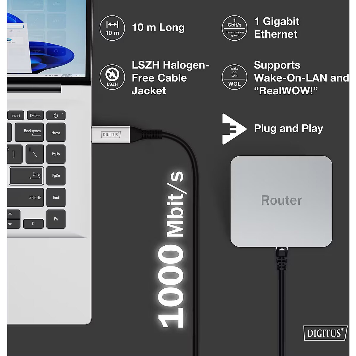 Name - Digitus USB-A 3.2 Gen1 > RJ-45 Ethernet cable, 1Gbit/s (black, 10 meters, 10/100/1,000Mbit/s)