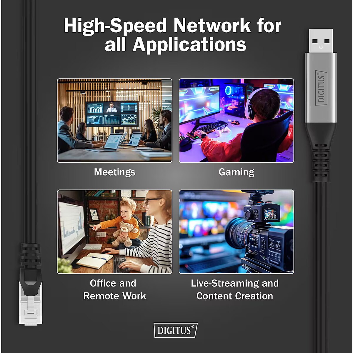 Pavadinimas - „Digitus“ USB-A 3.2 Gen1 > RJ-45 Ethernet kabelis, 1 Gbit/s (juodas, 10 metrų, 10/100/1 000 Mbit/s)