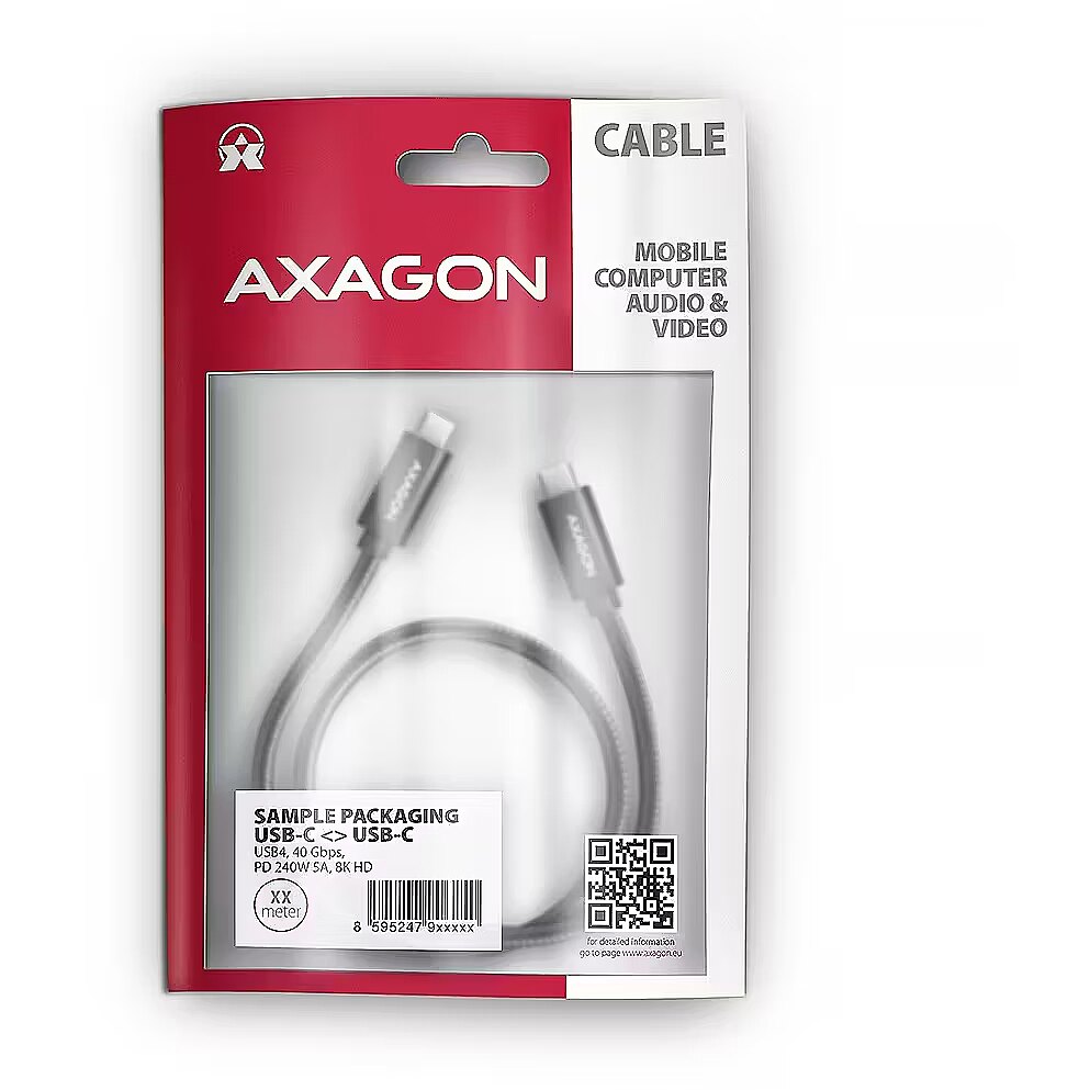 LongDesc - Premium connection USB-C USB-C Data and Charging AXAGON BUCM4X-CM05AB NewGen+ cable with USB-C male connectors at both ends. The cable has a full-featured USB 40 Gbps specification (USB4 Gen 3x2) connection and is fully compatible with Thunderbolt 3 and Thunderbolt 4 specifications. It is designed for the fastest data transfer, video transfer and charging of laptops, phones, tablets. Allows connection of monitors, docking stations and external SSDs.The cable supports up to 40 Gb/s data transfer and also allows image transfer up to 8K/60Hz Full Ultra HD resolution and audio. The cable has implemented the latest specification of Power Delivery 3.1 charging technology. This technology delivers, among other things, a power output of 240 W which is more than double that of Power Delivery 3.0, which delivers 100 W. You can use not only the Standard Power Range (SPR) for voltages of 5, 9, 15 and 20 V with a current of 5 A, but also sufficient power in fixed voltages of 28, 36 and 48 V with a maximum current of 5 A (Extended Power Range – EPR). Thanks to the new PD 3.1 technology, you can also use the cable to power devices with much more power, such as gaming laptops, 8K monitors, docking stations. To identify the cable and its current capabilities, the cable has an integrated E-Mark chip. The cable is also compatible with Quick Charge, PPS, Samsung AFC and SFC, Apple, SMART and other charging technologies.Cable conductors are made of Tin-plated oxygen free copper. Power cables 22 AWG (lower number = larger cross-section and lower wire resistance) and 32 AWG data wires guarantee fast charging and reliable data transfer of connected devices. High-quality cable insulation, made of flexible TPE, guarantees maximum durability and also maintains sufficient flexibility. Triple shielding protects transmitted signals from adverse interference. The cable is equipped with aluminum end caps, connectors with nickel-plated surface and gold-plated contacts. The final strength of the cable is provided by the nylon braid. The braid in combination with a cable gland significantly reduces dangerous cable bending. The cable life is extended to more than 8 000 standard bends.The bonus is the included practical strip for easy packing of the cable.Connectors:• 2× USB-C (M) male. Data and video transfer, charging:• 40 Gb/s, 8K/60Hz HDR10• Power Delivery 3.1 – 240 W (48 V / 5 A)Other features:• DATA SYNC & FAST CHARGING – simultaneous data and video transfer and mobile device charging.• Support for third generation transfer rates of 40 Gb/s.• USB4 Gen 3×2 Full-featured. • Compatible with Thunderbolt 4, Thunderbolt 3 (including Apple support). • Support for second generation transmission rates 20/10 Gb/s.• Compatible with USB4 Gen 2×2, USB 3.2 Gen 2×2 / USB 3.2 Gen 2. • Supports transfer rates of 5,000 / 480 Mb/s.• Compatible with USB 3.2 Gen 1 (before USB 3.1 Gen 1 / USB 3.0) / USB 2.0.• DisplayPort 1.4a, 2.0 protocol support for audio and video transmission up to Full Ultra HD 8K@60Hz, HDR10 resolution – a USB-C port with DisplayPort Alternate Mode (DP Alt Mode) support or a Thunderbolt 3/4 port is required.• Supported charging technologies: Power Delivery 2.0 / 3.0 / 3.1 240 W (48 V / 5 A), Qualcomm Quick Charge 2.0 / 3.0 / 4+, Samsung Adaptive Fast Charging, Huawei Fast Charge Protocol, SMART Charging and others.• Support for fast charging with a current of up to 5 A.• Integrated E-Mark chip.• Cable includes power wires 22 AWG, data wires 32 AWG. • Tin-plated oxygen free copper conductors to reduce oxidation, increase conductivity, and clear signal without distortion.• Double shielding via galvanized foil and tinned copper braiding minimizes interference and prevents signal loss.• Nickel-plated connectors and gold-plated contacts prevent oxidation and provide a reliable connection.• Suitable for MacBooks, iPhone 17 Pro / Pro Max, laptops, mobile phones and smartphones, tablets, power banks, chargers, monitors, docking stations, external SSD drives and other mobile devices with a USB-C connector.Other data: • Cable length: 0.5 m • Outer diameter of the cable: 5 mmPackage contains:• USB-C M USB-C M black cable,• tightening strip,• packed in sealed foil package with hanging hole.