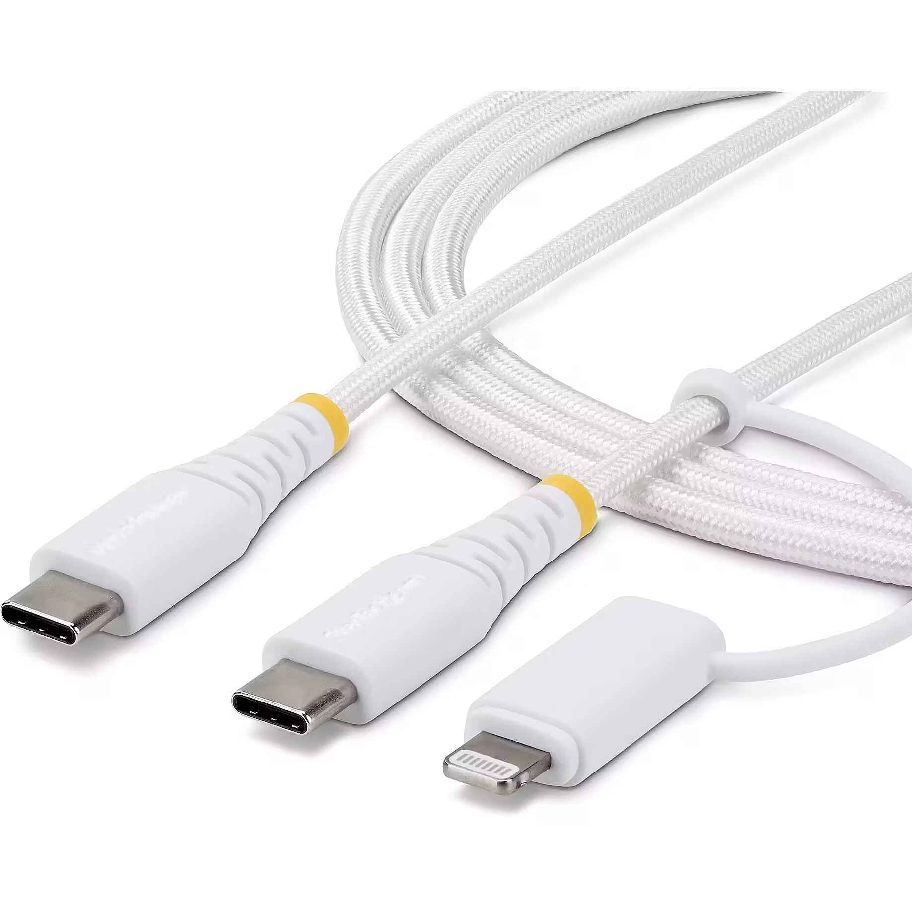 ShortSummaryDescription - StarTech.com 1m (3ft) 2-in-1 Rugged USB-C Charging Cable with Lightning Adapter, 30W/60W (3A), Apple MFi Certified, Braided USB C Charger Cord for iPhone/iPad/Android, 1 m, USB C, USB C, 0.48 Gbit/s, White