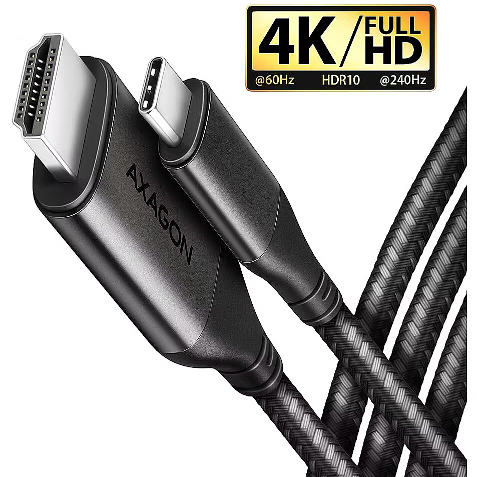 LongDesc - Modern USB-C > HDMI active cable - adapter AXAGON RVC-HI2MC for connecting a HDMI monitor/TV/projector to a notebook or phone using USB-C connector. A hardware converter ensures quality image up to 4K/60Hz Ultra HD resolution without any installation. Popular gaming resolution WQHD 2560 x 1440 at 60, 120 and 144 Hz or FullHD 1920 x 1080 at 60, 120, 144 and 240 Hz are also supported. Thanks to HDR (high dynamic range) support, you can enjoy a significantly expanded range of colors and contrasts without restrictions.Durable cable is equipped with solid metal ends, connectors with a nickel-plated surface and gold-plated contacts. The final strength of the cable is provided by the nylon braid. The bonus is a practical strip for easy packing of the cable. Video and audio transfer from a computer, laptop, phone or Apple MacBook will now be easy.Compact dimensions provide the possibility to use the cable in insufficient space. The converter dimensions are almost identical to the standard cable connectors. You have an ideal solution - you don't need a cable and converter, with this active cable everything is integrated into one compact unit.The cable is only oneway, i.e. USB-C to HDMI, not otherwise. A USB-C port with DisplayPort Alternate Mode (DP Alt Mode) support of a device with Thunderbolt 3/4 port is required for the adapter to function properly. Input:• USB-C• USB type C (M) male connectorOutput:• HDMI 2.1a 4K/60Hz HDR10 (before HDMI 2.0a)• HDMI (M) male connectorSupported resolutions:• max. 4096 x 2160 (19:10) @60Hz DCI 4K• 3840 x 2160 (16:9) @60Hz UHD-1 4K (UHDTV)• 3840 x 1600 (21:9) UW 4K (Ultrawide 1600p)• 3840 x 1200 (32:10) 29:9 4K (Super ultrawide 1200p)• 3840 x 1080 (32:9) 32:9 4K (Super ultrawide 1080p)• 3440 x 1440 (21:9) UWQHD (Ultrawide 1440p)• 2560 x 2048 (5:4) QSXGA• 2560 x 1920 (4:3)• 2560 x 1600 (16:10) WQXGA• 2560 x 1440 (16:9) @60, 120 a 144Hz QHD• 2560 x 1080 (21:9) UWFHD (Ultrawide 1080p)• 2048 x 1536 (4:3) QXGA• 2048 x 1152 (16:9) QWXGA• 1920 x 1440 (4:3) • 1920 x 1200 (16:10) WUXGA• 1920 x 1080 (16:9) @60, 100, 120, 144 a 240Hz Full HD/1080p• 1856 x 1392 (4:3)• 1792 x 1344 (4:3)• 1680 x 1050 (16:10) WSXGA+• 1600 x 1200 (4:3) UXGA• 1600 x 900 (16:9) HD+• 1536 x 864 (16:9)• 1440 x 900 (16:10) WXGA+• 1400 x 1050 (4:3) SXGA+• 1366 x 768 (16:9) HD• 1360 x 768 (16:9) HD• 1280 x 1024 (5:4) SXGA• 1280 x 960 (4:3) SXGA-• 1280 x 800 (16:10) WXGA• 1280 x 768 (5:3) WXGA• 1280 x 720 (16:9) HD/WXGA/720p• 1280 x 600• 1152 x 864 (4:3) XGA+• 1024 x 768 (4:3) XGA• 800 x 600 (4:3) SVGA* the adjustable resolution and frequencies depend on monitor/TV/projector and graphics adapter parameters.Other features:• Supported modes: mirroring the desktop (default setting),extension of the primary monitor area.• HPD (Hot-Plug-Detect) support - communication sequence controlling the connection/disconnection of the device while running,• Support up to 8-channel sound - 96 kHz at 24 bits,• HDR (High dynamic range, 10 bit support) support - realistic reproduction of light and dark details.• Compliant with USB Type-C Cable and Connector Specification Revision 1.1 specification,• Compliant with VESA DisplayPort Alt Mode on USB Type-C Standard Version 1.0 specification,• Compliant with USB Device Class Definition for Billboard Devices Revision 1.0 specification.• Compliant with HDMI Specification 2.1a 4K/60Hz HDR10 specification (before HDMI 2.0a).• TMDS (Transition Minimized Differential Signaling) support - transfer of auxiliary image, sound and additional data.• HDCP 2.2 (High-bandwidth Digital Content Protection) support - a mechanism used to protect the digital contents.• Support of power saving modes with spinning down controlled by a source device (PC) and a viewing device (monitor/TV).• Power supply via USB-C – no external power is needed.• Dimensions of converter body 48 x 21 x 10 mm,• Total cable length incl. connector 180 cm,• Weight 70 g,• Operating temperature 0 ~ 45°C.• Storage temperature: -10 ~ 70°C.Supported OS: • Microsoft Windows, macOS, Android and Chrome OS – updated.• Compatibility depends on the operating system and device manufacturer support.• Graphics card drivers may also affect RVC-HI2MC functionality. We recommend downloading the latest version of the drivers.Package contains:• USB-C > HDMI cable length 1.8m,• multilingual manual CZ / DE / DK / ENG / ESP / FIN / FR / GR / HR / HU / IT / NL / PL / PT / RO / RU / SK / SWE / BG / CN / TR / ARA,• packed in a cardboard box with a hanging hole.