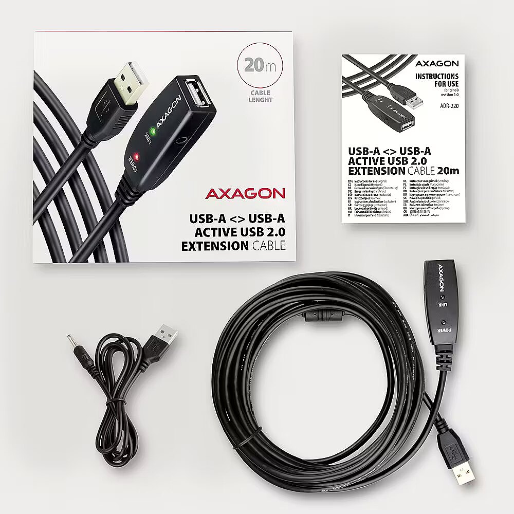 LongDesc - Active extension AXAGON ADR-220 USB 2.0 cable, 20 m long is ideal for connecting your computer to a USB device such as a mouse, keyboard, webcam, printer, scanner, plotter and others. The active USB repeater cable strengthens the passing signal and allows you to connect a significantly more distant USB device than the usual passive cable. The range of the cable can be further extended by using several cables in a row.A great advantage of the ADR-220 extension is an integrated auxiliary power supply connector. In most cases, USB bus power is sufficient, but for devices with larger power consumption the USB power supply may be inadequate and auxiliary power from the mains may resolve the problem. The remarkably compact body of the repeater cable allows trouble-free use in electrical installation strips or cable systems.The use of a high-quality shielded cable ensures high communication speed and minimal undesirable interference. Input:• USB 2.0 for connection to a computer• USB Type A (M) male connectorOutput:• USB 2.0 for connecting a remote USB device• USB Type A (F) female connector • transmission rate 480 / 12 / 1.5 Mbit/s (high / full / low speed)Power supply:• Power supply of the cable and connected devices via USB bus (bus-power mode 5V - 500mA).• For most connected USB devices, the power supply via USB bus is sufficient and no auxiliary power is required.• The active part of the cable includes a connector (Ø 3.5 x 1.3 mm outer x internal diameter) for additional external power supply of 5V/ 1-2 A.• The power cable USB A-M / 3.5mm jack, 1.2 m long is included. The cable allows powering from a standard mobile phone charger with USB-A output 5V / min. 1A, e.g. AXAGON ACU-DS16. • When powering the repeater cable with the power adapter, an external 2.5" disk can be connected without the need for own power supply to the disk.• For longer USB route with multiple repeater cables connected in a row, the USB bus supply may be inadequate for USB devices with lower power consumption than an external 2.5" drive. Also, in this case it can help to boost the power supply by connecting a power adapter.Other features:• Fully compatible with USB 2.0 and backward compatible with USB 1.1. • Full Plug and Play and Hot Plug support. • Two LEDs indicating power and USB connection. • Behind the active USB cable, a common passive USB cable can also be used.• Dimensions of active part with are 74 x 22 x 13 mm, cable length 20 m. • Weight 646 g.Supported OS: • MS Windows XP / Vista / 7 / 8 / 8.1 / 10 / 11 and later, Windows Server 2003 / 2008 / 2012 / 2016 / 2019 and later (all 32- and 64-bit Windows versions supported), Mac OS X 10.x and higher Linux with 2.6.x kernel and higher. • Note: Drivers are included with supported operating systems and will be installed automatically. No other drivers need to be installed and are not even available.Package contains:• USB 2.0 A-M > A-F active repeater 20 m long,• USB-A / 3.5 mm power cable,• multilingual guide CZ / DE / DK / ENG / ESP / FIN / FR / GR / HR / HU / IT / NL / PL / PT / RO / RU / SK / SWE / TR / BG / CN / ARA,• packed in a cardboard box.