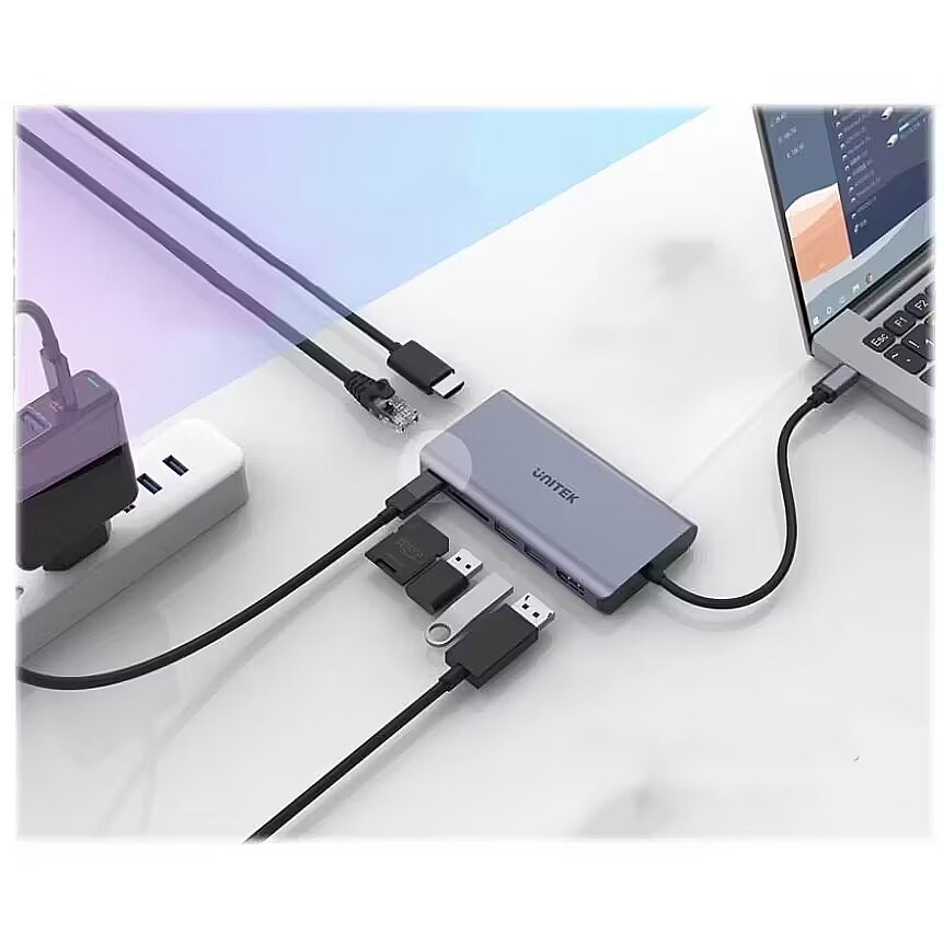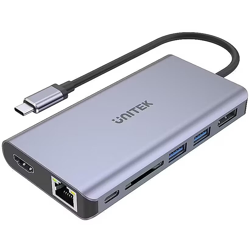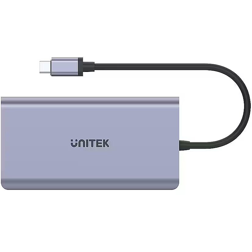 Description - Superszybki transfer danych Lekkie i mobilne ultrabooki z bezprzewodowym połączeniem z siecią mają swoje zalety, ale czasem potrzebujesz czegoś więcej. Wielofunkcyjny replikator portów umożliwia podłączenie gigabitowego Internetu do komputera bez portu RJ45. Hub umożliwia także podłączenie dwóch urządzeń przez typowe USB-A np. pendrivea, myszki czy tabletu graficznego i transfer danych zgodny ze standardem SuperSpeed USB 3.1 Gen1. Transfer 5 Gbps będzie miał znaczenie także przy korzystaniu z czytnika kart SD błyskawicznie skopiujesz tysiące zdjęć z wakacji. Podłącz dwa monitory 4K przez USB C Praca na 13-calowym monitorze jest wygodna w drodze, ale w domu czy biurze zdecydowanie lepiej korzystać z dużego ekranu. Adapter USB C na HDMI 2.0 i DP umożliwiają podłączenie dwóch monitorów lub telewizorów do komputera. Rozdzielczość 4K przy próbkowaniu 30Hz daje krystalicznie ostry i nasycony obraz, a obsługa Audio 7.1 Dolby Digital niezapomniane wrażenia dźwiękowe. Aby skorzystać z tej funkcji port USB C w tablecie czy laptopie musi obsługiwać DisplayPort Alt Mode lub być zgodny z Thunderbolt 3. Na komputerach z systemem Windows lub Linus możliwe jest korzystanie z dwóch dodatkowych monitorów w trybie rozszerzania pulpitu (maksymalna rozdzielczość HDMI 1080P@60Hz). Power Delivery 100 W Hub jest wyposażony w technologię Power Delivery 100W, co oznacza, że można wydajnie ładować komputer przewodem podłączonym do portu USB C w hubie. Nawet jeśli masz tylko jeden port USB-C w ultrabooku nie musisz iść na kompromisy i decydować co jest ważniejsze bateria czy dodatkowe funkcje. Ponadto hubem można ładować urządzenia przez porty USB-A także bez podłączania dodatkowego zasilania. Mimo tak wielu funkcji hub ma dość małe rozmiary i łatwo się go przechowuje. Giętki przewód o długości 17 cm pozwala na wygodne podpięcie wszystkich potrzebnych urządzeń. Aluminium w modnym kolorze świetnie pasuje do nowoczesnej elektroniki. Jakość gwarantowana Unitek jest pewien jakości swoich produktów, dlatego wszystkie urządzenia w Polsce są objęte dożywotnią gwarancją dystrybutora. Oznacza to, że w przypadku ewentualnych problemów technicznych, możesz odesłać sprzęt do serwisu za pomocą pobliskiego paczkomatu. Odwiedź lokalną stronę marki Unitek, żeby dowiedzieć się więcej lub uzyskać pomoc techniczną. Rozbudowany replikator portów z 7 funkcjami Wyjścia video HDMI i DP, funkcja MST Gigabit Ethernet 2 porty USB-A Port USB-C Czytnik kart SD Power Delivery 100W