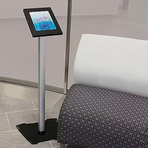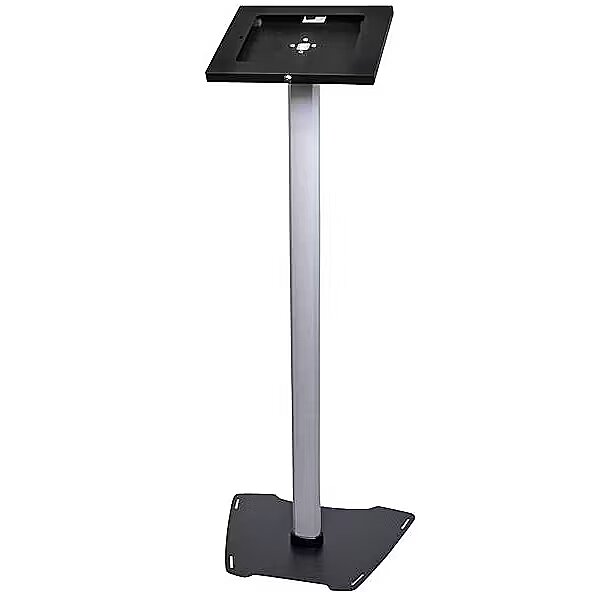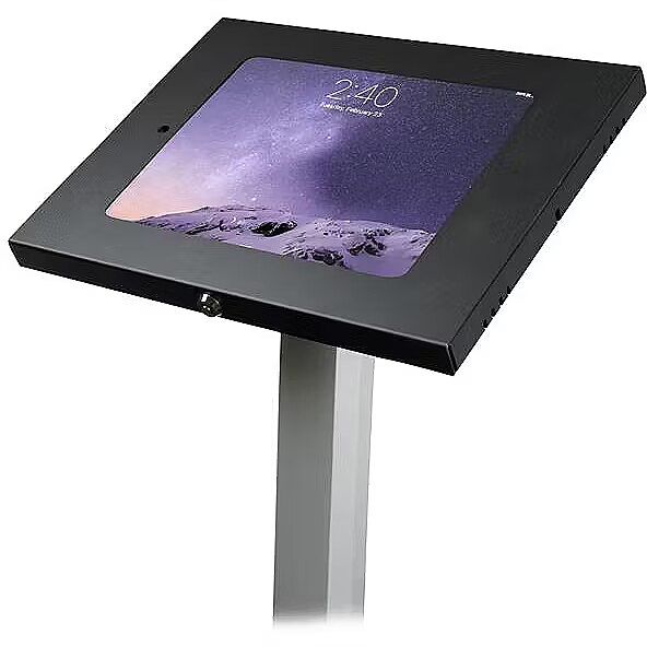 LongDesc - Lockable Tablet Stand | For 9.7" Tablets | Metal Construction | Fixed HeightThis secure tablet floor stand lets you set up a tablet as an interactive marketing kiosk or product display. It supports an Apple iPad, iPad Air or other 9.7" tablets.This TAA compliant product adheres to the requirements of the US Federal Trade Agreements Act (TAA), allowing government GSA Schedule purchases.Provide an Engaging Customer-Facing DisplaySet up a single tablet in the lobby or use multiple stands throughout your organization or tradeshow display, to gain maximum exposure and impact. You can use the stand for applications, such as:• Giving customers instant access to new product information• Welcoming visitors• Connecting customers to your own app to enhance the user experienceThe Home button is covered, allowing you to direct users to specific information or apps and preventing them from navigating the tablet at their leisure.Secure Your TabletThe secure tablet stand features a lockable holder that helps protect your tablet from loss or damage. Plus, you can screw the base of the steel and aluminum stand into the floor, to create a fixed-in-place holder.Create an Attractive DisplayDesign an impressive display unit for your tablet, in either a portrait or landscape position. The stand has a fixed height of approximately 42" (1060 mm) and features built-in cable management to ensure a tidy display. To power your tablet, discreetly thread the tablet's charge cable through the pillar-style stand.The TAA compliant STNDTBLT1FS is backed by a 3-year StarTech.com warranty and free lifetime technical support.The StarTech.com Advantage