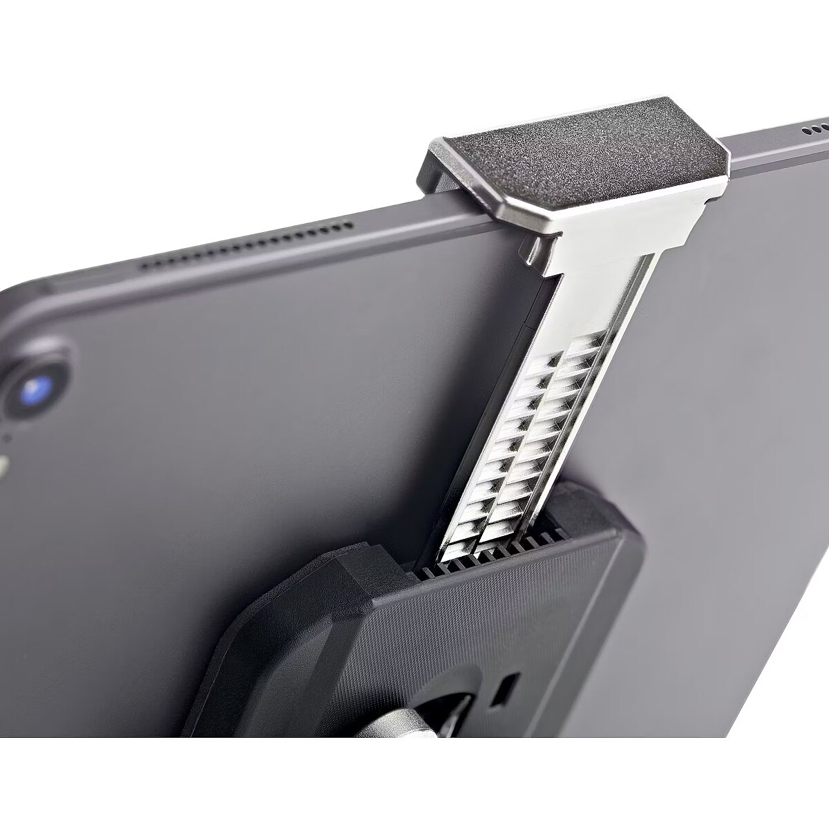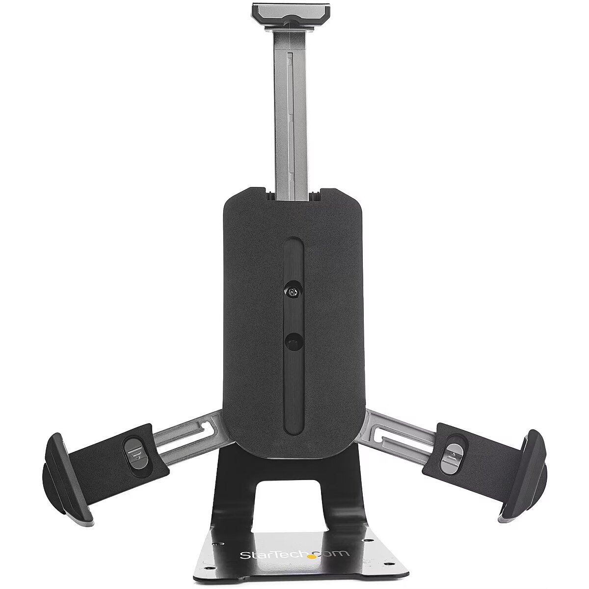 LongDesc - Adjustable Tablet Stand | Support for tablets up to 13" | K-slot lock (6ft)This universal tablet holder enables you to mount and use your tablet as a second display, or as a point of sales terminal while having access to all ports/buttons/cameras. Works with tablets between 7.9" and 13"; and it supports tablets up to 0.3" thick and up to 1.5lb / 0.7kg in weight. Its extendable and locking gripping arms holds the tablet in place to avoid it slipping from the stand while you are interacting or typing on it.Range of motionTilt (180°) and rotate (360°) your tablet to adjust it to the ideal viewing angle depending on your application, whether it is in portrait or landscape mode. The 2 pivot point design helps in providing the same range of motion for small and bigger tablets.Secure your devicesThe secure tablet display stand offers several ways to protect your devices, especially in cases where you need to leave your equipment unattended. It comes equipped with 2x Kensington slots (k-slots) so you can use with anchor or in multi-lock setups using the Universal Laptop Cable Lock Expansion Loop - BRNCHLOCK (not included). For added security, you can also screw the stand to a desk or countertop using the including screws.Thoughtful designSECTBLTDT has been designed with your devices in mind, foam padding and spacers are built-in into the gripping arms to make sure your device stays in place while protecting it from scratches or scuffs. In addition, it comes with rubber feet pads to protect your desk or mounting surface.You can run your cables through the back thanks to the cable management openings, keeping a tidy and organized setup.The StarTech.com Advantage