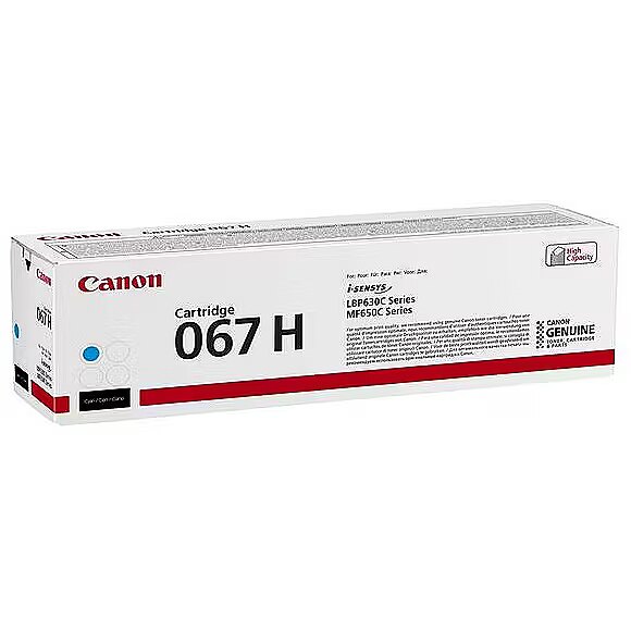 LongDesc - A high yield cyan toner cartridge enabling high quality printing and longevity with compatible i-SENSYS printersUse the high yield cyan toner cartridge 067H with your compatible laser printer to ensure your prints always look their best. A full cartridge yields approximately 2,350 pages (ISO/IEC 19798), providing the longevity needed to handle all your printing demands.- Ensure optimum printing quality with genuine Canon toner- Print more with a high yield cyan cartridge for prints up to 2,350 pages- Compliant with RoHS (2011/65/EU) and its amendments, including (2015/863/EU) and other RoHS-like legislations in countries/regions outside the EU, which means that materials are less hazardous to the environment- Return every toner cartridge to be reused or recycled – it's free, easy and environmentally responsible
