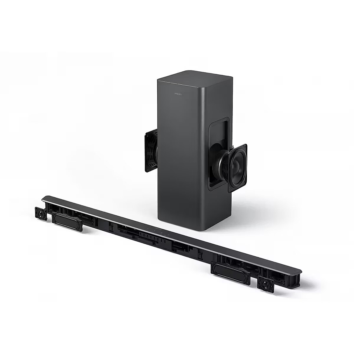 LongDesc - 2.1 kanalai. Belaidis žemų dažnių garsiakalbis - gilesni bosai2.1 kanalai ir įtraukiančio garso technologija suteikia naują garso lygį, o itin kompaktiškas belaidis žemų dažnių garsiakalbis efektams ir muzikai suteikia įspūdingo svorio. Keturi ekvalaizerio režimai leidžia pasirinkti garso stilių, atitinkantį tai, ką žiūrite, o balsai bet kuriuo režimu tampa aiškesni, jei įjungiate "Dialogue Enhancement" funkciją.Itin plonas dizainas, puikiai tinkantis žemiems "Ambilight" televizoriamsŠios garso juostos profilis vos 37 mm: ji tilps net po "Ambilight" televizoriais su žemesniais stovais, o nuimami sieniniai laikikliai (įtraukti į komplektą) suteikia daugybę galimybių. Itin kompaktišką, galingą žemų dažnių garsiakalbį lengva paslėpti, o jį galite išdėstyti vertikaliai arba horizontaliai.DTS Virtual:X - svaiginantis 3D garsas bet kurioje patalpojeSuderinamumas su DTS Virtual:X transformuoja televizoriaus garsą, suteikdamas virtualaus 3D garso patirtį, nesvarbu, kas rodoma ekrane! Jums nereikia papildomų garsiakalbių, be to, jis veikia bet kuriame kambaryje: įjunkite jį naudodami garso juostos nuotolinio valdymo pultą arba "Philips Home Entertainment" programėlę.Dolby Atmos. Įtraukiantis kino garsas namuose"Dolby Atmos" garso efektus perkelia į erdvę aplink jus ir virš jūsų, sukurdama trimatį erdvinį garsą, kuris įtraukia giliau. Jį suaktyvinkite garso juostos nuotolinio valdymo pulte esančiu erdvinio garso mygtuku arba naudodamiesi "Philips Home Entertainment" programėle. Jausitės tarsi būtumėte pačiame veiksmo centre.Valdykite garso juostą ir televizorių vienu nuotolinio valdymo pulteliuTelevizoriaus nuotolinio valdymo pulteliu galite reguliuoti garso juostos garsumą. Jei turite "Philips Ambilight" televizorių, "EasyLINK" funkcija leidžia nuotolinio valdymo pulteliu perjungti iš anksto nustatytus garso juostos ekvalaizerio režimus, reguliuoti žemus ir aukštus dažnius - ir dar daugiau.Prijunkite mėgstamus šaltinius, kad garsas būtų geresnisSuderinamumas su "Bluetooth LE Audio" užtikrina stabilesnį ryšį, geresnį garsą ir mažesnį vėlavimą, jei grojaraščius transliuojate iš išmaniojo įrenginio, kuris taip pat suderinamas su "Bluetooth LE Audio". Garso šaltinius prie garso juostos taip pat galite prijungti per garso įvestį, USB arba optinę įvestį."Philips Home Entertainment" programėlėĮsisiųskite programėlę ir išmaniuoju įrenginiu galėsite perjungti EQ garso režimus, pasirinkti šaltinį, įjungti virtualų erdvinį garsą ir dar daugiau.