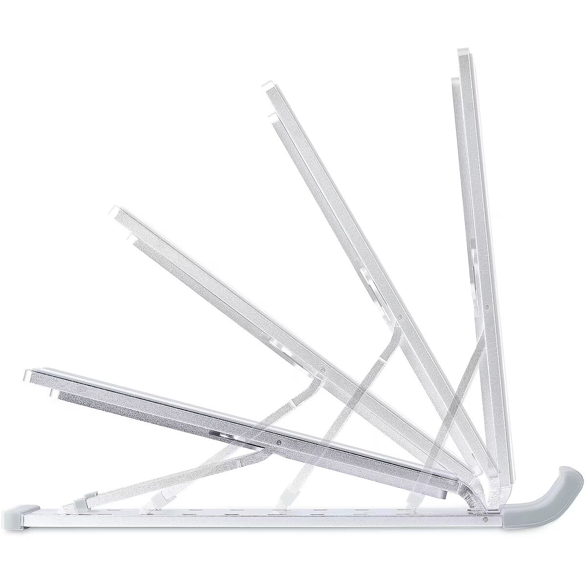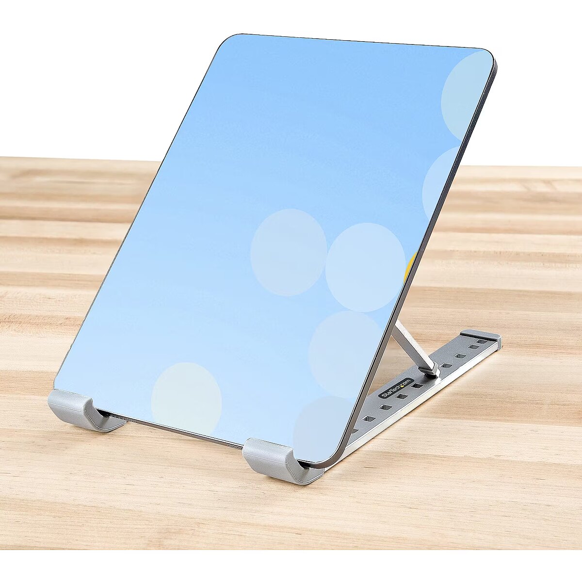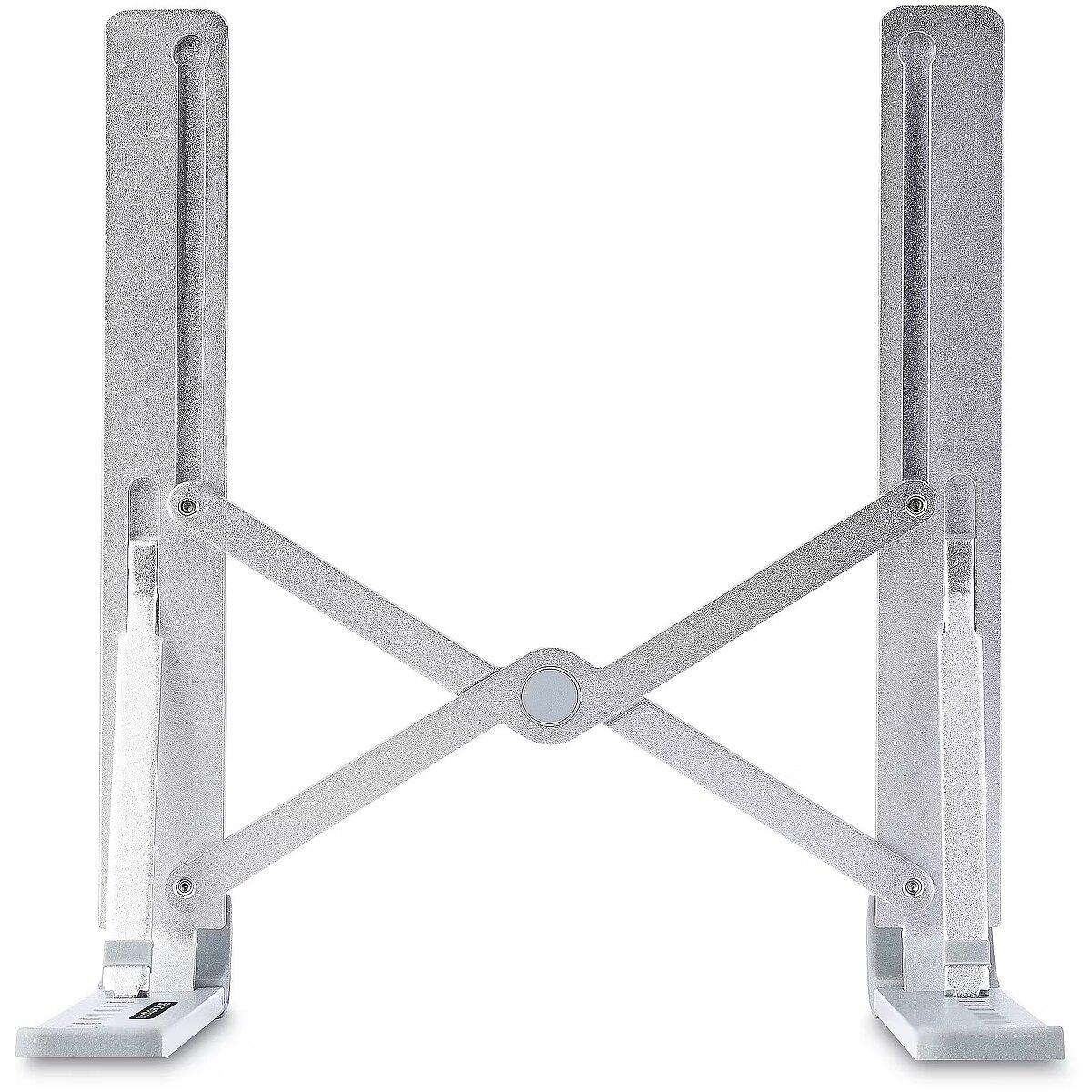 LongDesc - Ergonomic Holder | Adjustable Width | Collapsible | Lightweight | Variable Viewing AnglesAdjust the viewing angle of a laptop's base panel/keyboard, using this laptop riser stand. Featuring a collapsible frame with adjustable width, this stand supports smaller phones/tablets as well as portable monitors, and laptops with screen sizes of up to 15.6". The stand is capable of supporting devices of up to 22lb (10kg). It ships fully assembled, ready for immediate deployment.Tilted for Ideal ViewingThe ergonomic laptop stand features 9 different angle adjustments (15° / 27° / 37° / 45° / 52° / 60° / 67° / 75° / 84°) to help find the most comfortable viewing angle. The raised lip at the front and the anti-slip rubber pads prevent the laptop from shifting while making adjustments and during operation. In addition, the pads protect the mounted device from cosmetic damage.Collapsible DesignThe ultra-lightweight (0.73lb / 329g) collapsible stand is ideal for users who require a stand that is portable and can be quickly deployed. Transport the fully collapsed stand in the included storage pouch. The width of this laptop computer stand is adjustable, ranging from 2-7.17in (5.1-18.2cm), ensuring multi-device compatibility. Once the stand is folded, the dimensions are 9.4 x 2 x 0.9in (24.1 x 5.1 x 2.4cm).Sturdy Laptop StandThe elegant laptop riser features aluminum construction to ensure durability and sturdiness and a silver anodized finish complements the design. The support area facilitate passive cooling by reducing airflow restriction around the base of the mounted device. Non-skid rubber feet protect the work surface from scratches and scuffs, including glass top desks.This product is backed for five years, including free lifetime 24/5 multi-lingual technical assistance.The StarTech.com Advantage