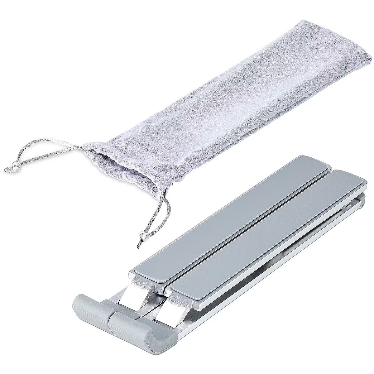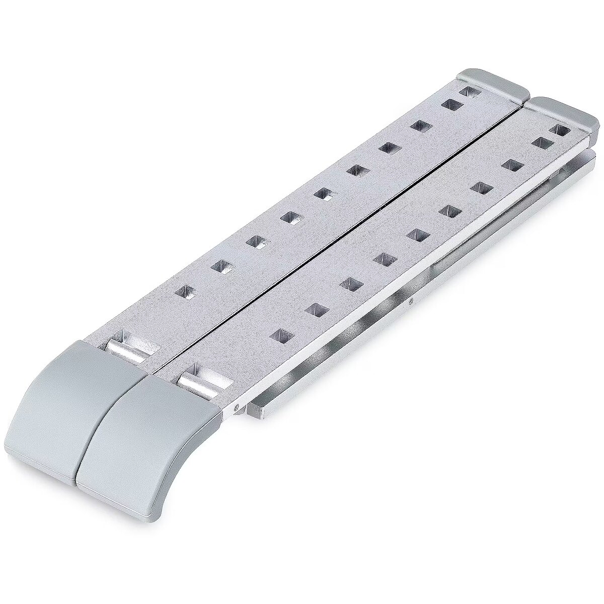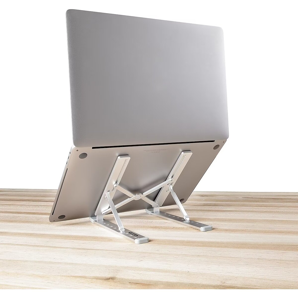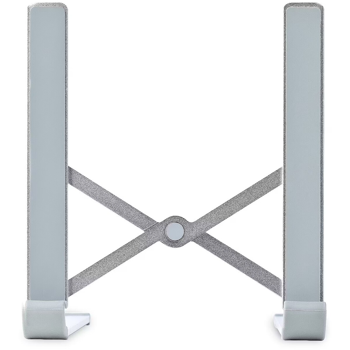 LongDesc - Ergonomic Holder | Adjustable Width | Collapsible | Lightweight | Variable Viewing AnglesAdjust the viewing angle of a laptop's base panel/keyboard, using this laptop riser stand. Featuring a collapsible frame with adjustable width, this stand supports smaller phones/tablets as well as portable monitors, and laptops with screen sizes of up to 15.6". The stand is capable of supporting devices of up to 22lb (10kg). It ships fully assembled, ready for immediate deployment.Tilted for Ideal ViewingThe ergonomic laptop stand features 9 different angle adjustments (15° / 27° / 37° / 45° / 52° / 60° / 67° / 75° / 84°) to help find the most comfortable viewing angle. The raised lip at the front and the anti-slip rubber pads prevent the laptop from shifting while making adjustments and during operation. In addition, the pads protect the mounted device from cosmetic damage.Collapsible DesignThe ultra-lightweight (0.73lb / 329g) collapsible stand is ideal for users who require a stand that is portable and can be quickly deployed. Transport the fully collapsed stand in the included storage pouch. The width of this laptop computer stand is adjustable, ranging from 2-7.17in (5.1-18.2cm), ensuring multi-device compatibility. Once the stand is folded, the dimensions are 9.4 x 2 x 0.9in (24.1 x 5.1 x 2.4cm).Sturdy Laptop StandThe elegant laptop riser features aluminum construction to ensure durability and sturdiness and a silver anodized finish complements the design. The support area facilitate passive cooling by reducing airflow restriction around the base of the mounted device. Non-skid rubber feet protect the work surface from scratches and scuffs, including glass top desks.This product is backed for five years, including free lifetime 24/5 multi-lingual technical assistance.The StarTech.com Advantage