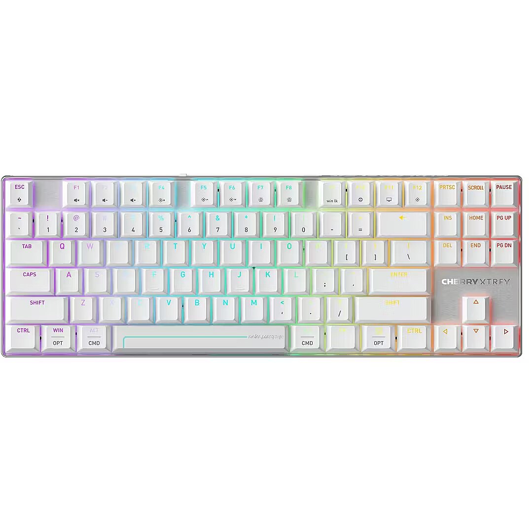 LongSummaryDescription - CHERRY MX 8.2 Pro TMR Wireless. Keyboard form factor: Tenkeyless (80 - 87%). Keyboard style: Straight. Connectivity technology: Wired & Wireless, Device interface: USB + RF Wireless + Bluetooth, Keyboard key switch: Magnetic-mechanical key switch, Keyboard layout: QWERTY, Keyboard number of keys: 88. Backlight type: RGB LED. Cable length: 1.8 m. Recommended usage: Gaming. Product colour: Silver, White