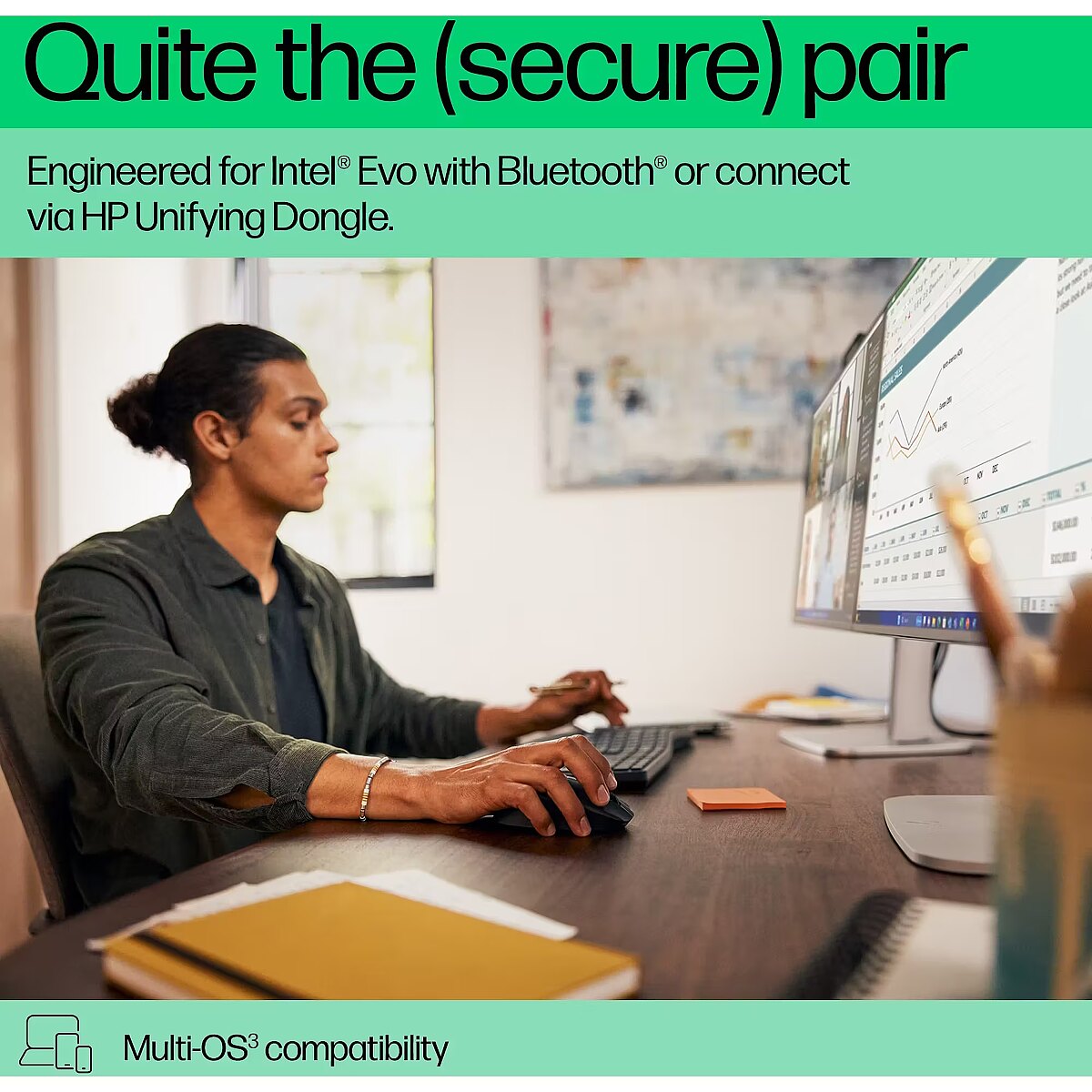 Būkite ramūs žinodami, kad ši dviejų režimų klaviatūra ir pelė be jokių rūpesčių sinchronizuojasi su keliais įrenginiais. Sklandus „Bluetooth“ ryšys ir patikimas „HP Unifying“ raktas apsaugo viską, ką prijungiate. Sukurtas „Intel Evo“ įrenginiams ir suderinamas su keliomis operacinėmis sistemomis, kad darbo eiga būtų sklandesnė ir saugesnė.