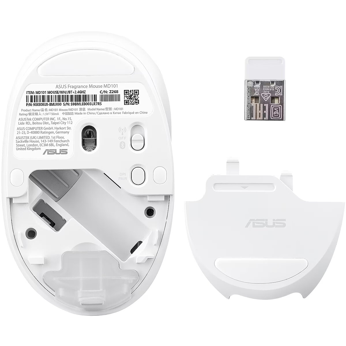 LongSummaryDescription - ASUS Fragrance Mouse MD101. Form factor: Ambidextrous. Movement detection technology: Optical, Device interface: RF Wireless + Bluetooth, Movement resolution: 2400 DPI, Buttons type: Pressed buttons, Buttons quantity: 3, Scroll type: Wheel. Power source: Batteries. Product colour: White