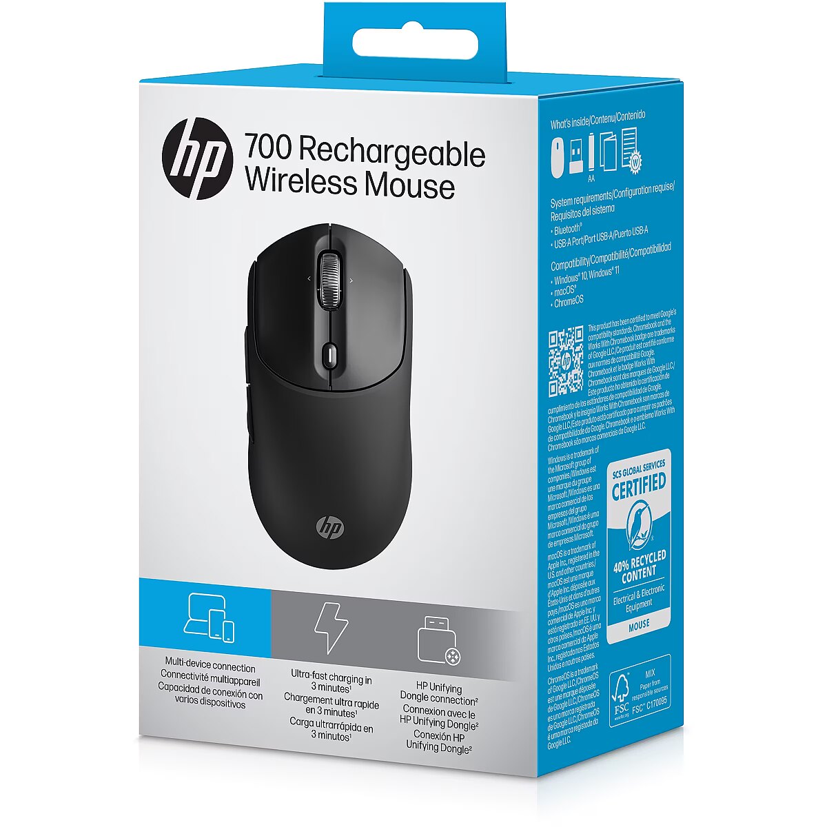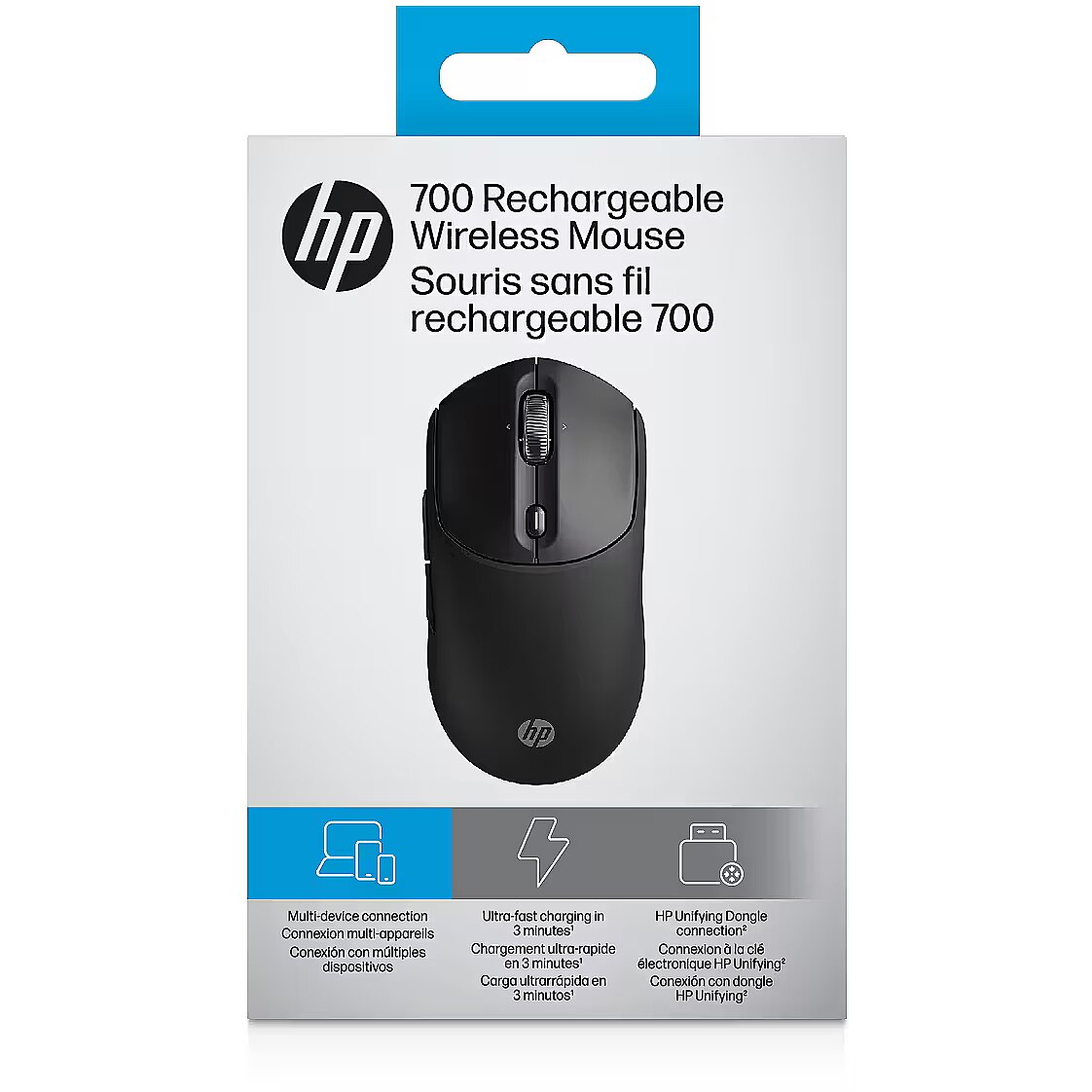 LongSummaryDescription - HP 700 Rechargeable Wireless Mouse. Form factor: Ambidextrous. Device interface: RF Wireless + Bluetooth, Movement resolution: 6000 DPI, Buttons type: Pressed buttons, Buttons quantity: 8, Scroll type: Wheel. Power source: Batteries. Works on any surface. Product colour: Black