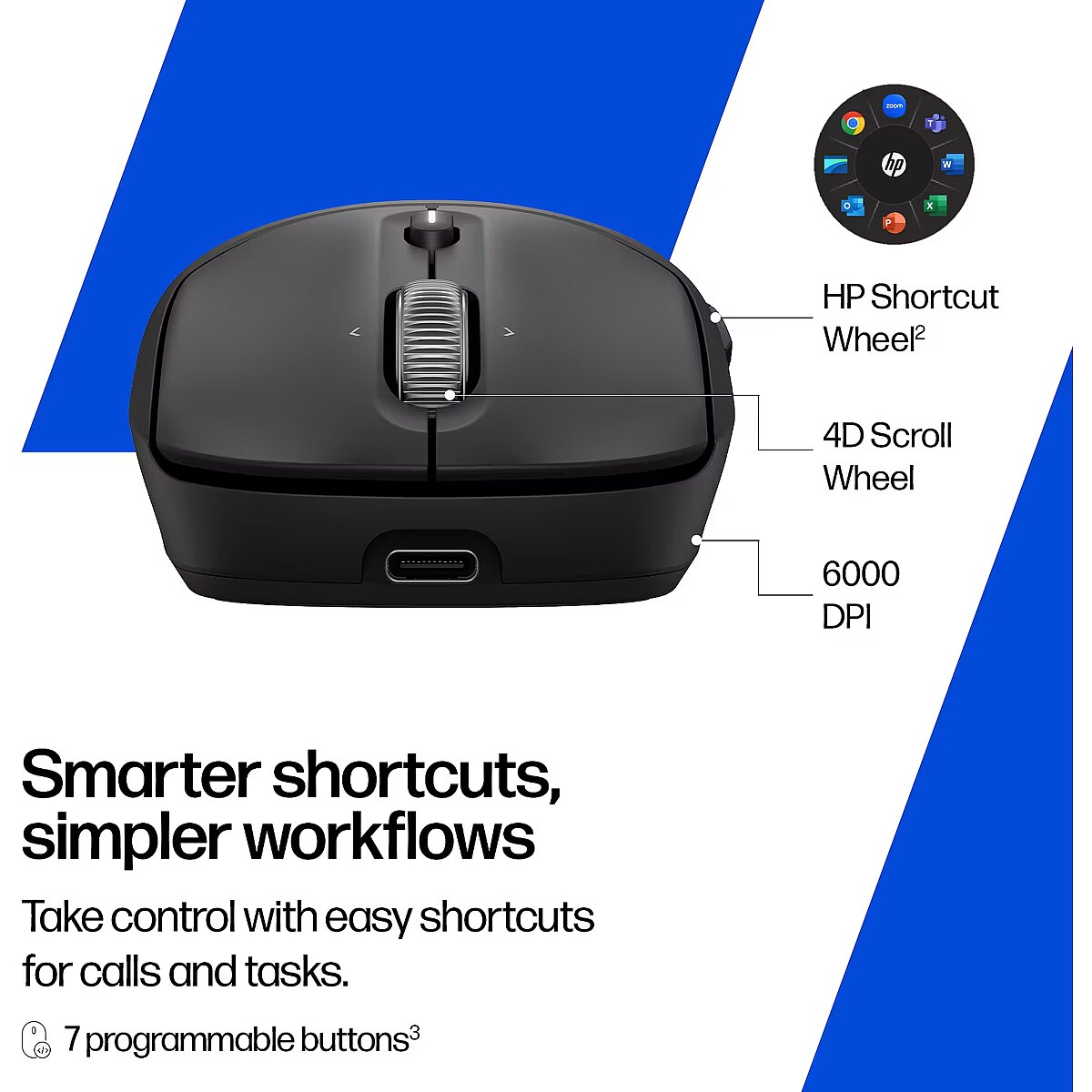 Supaprastinkite darbo eigą ir naudokitės pažangesniais sparčiųjų klavišų deriniais, skirtais konferencijų skambučiams ir produktyvumo užduotims, naudodami „HP Shortcut Wheel“, 7 programuojamus mygtukus, specialų „Copilot“ mygtuką ir metalinį greito slinkties ratuką.