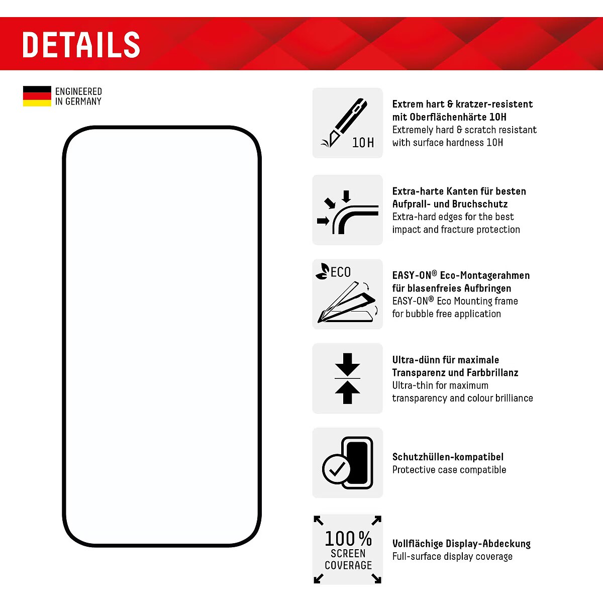 LongDesc - Full Cover or 3D/ Curved Real Glass with EASY-ON® Eco Mounting Frame Full screen coverageCompared to the so-called 2D protective glasses, Displex Full Cover protective glasses cover not only the active display area, but the entire display area. This means optimum protection of the entire display and an improved user experience: maximum protection without annoying edges.This feature is particularly advantageous for smartphones with rounded displays. Since the screen protector adapts perfectly to the rounded display and thus protects the entire display area. Tempered glass with rounded edgesAll Displex protective glasses have a surface hardness of 10H and are therefore not only more scratch-, break- and shock-resistant than comparable brand products, but even surpass sapphire glass, which is used in luxury watches and has a hardness of 9H.Even the edges, the area of the smartphone and protective glass most susceptible to breakage and impact, are specially hardened, rounded by 4-fold polishing and finished with a shock-absorbing edge. This elaborate production process further increases the protection against knocks and bumps and allows a particularly pleasant use of the smartphone. With these features, the protective glass is extremely resistant and guarantees maximum breakage resistance. Case-friendlyOur Displex protective glass is manufactured to within 5/100 mm of the smartphone contours and therefore fits perfectly on your smartphone. In addition, the protective film is ultra-thin at 3mm. This means that all standard-sized protective cases can be used with the screen protection glass. Thus, your smartphone is optimally protected all around by a combined protection of the Displex Tempered Glass and your favourite case. Anti fingerprint coatingThe top layer of our 4-Layer Technology is a high-tech plasma coating. With an extremely long-lasting effect, this coating effectively repels fingerprints. In addition, the plasma coating guarantees a soft scrolling experience. This technology not only makes your display look better, but it also keeps it cleaner and therefore requires less frequent cleaning. High-tech splinter protectionThe high-tech shatter protection integrated in the Real Glass from Displex guarantees absolute safety even if the protective glass breaks. Thanks to the composite material of the second layer in the protective glass, it does not shatter and thus guarantees absolutely safe use. If the worst should come to the worst and the protective glass has absorbed a blow, fall or impact and is broken, the Displex protective glass can be easily pulled off the display in one piece thanks to the integrated high-tech shatter protection. High-performance adhesiveOnce the protective glass has been fitted, the high-performance adhesive ensures optimum adhesion properties and a clear look. The adhesive is adapted to all display coatings of the various manufacturers so that the protective film for mobile phones holds reliably in the long term. The visual appearance is not affected either: despite the screen protection film, you can enjoy gripping videos and photos with maximum transparency and colour fidelity. Simple & bubble-free applicationWith the EASY-ON® Eco Mounting Frame and the accompanying video tutorials, mounting the tempered glass is incredibly quick, easy and precise. In addition the EASY-ON® Eco Mounting Frame is made of premium solid cardboard and is therefore not only sustainable, but also a 100% recyclable. The result is worth seeing: no crooked positioning of the screen protector on the display, no concealed openings for speakers or microphones and certainly no bubbles under the protective glass.