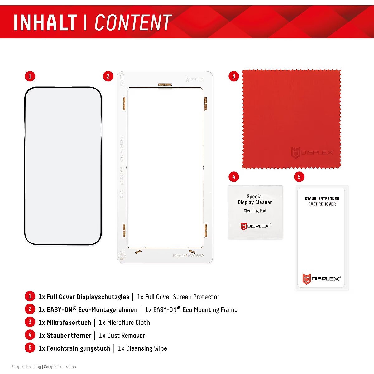 ShortSummaryDescription - Displex Full Cover Screen Protector (10H) for Apple iPhone 15/15 Pro, Eco Mounting Frame, Full Cover, Apple, iPhone 15/ iPhone 15 Pro, Dry application, Impact resistant, Scratch resistant, Dust resistant, Transparent, 1 pc(s)