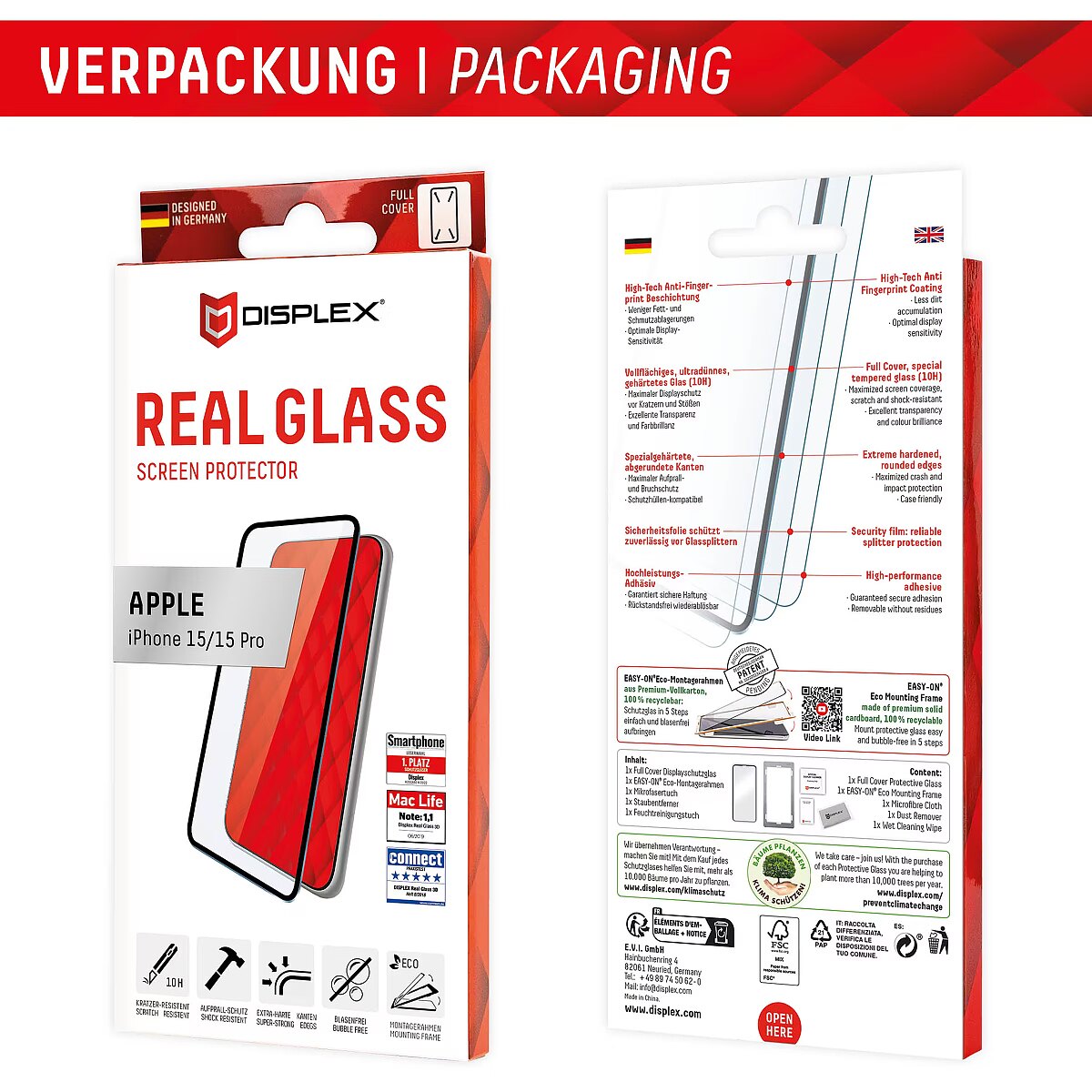 LongProductName - DISPLEX Full Cover Screen Protector (10H) for Apple iPhone 15/15 Pro, Eco Mounting Frame, full screen coverage, Tempered Glass, scratch resistant protective film, case friendly
