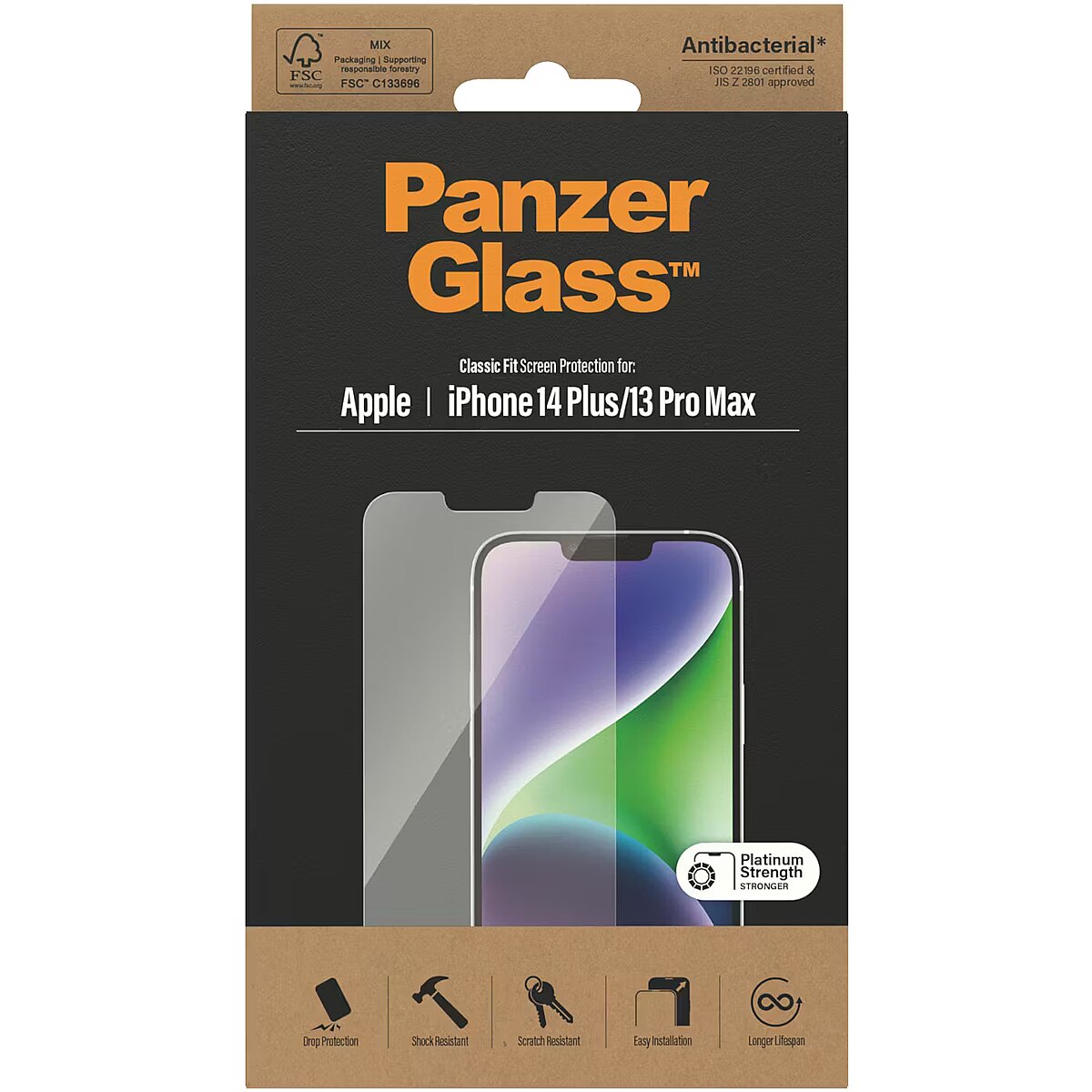 LongSummaryDescription - PanzerGlass ® Screen Protector iPhone 14 Plus | 13 Pro Max | Classic Fit. Brand compatibility: Apple, Compatibility: Apple - iPhone 14 Plus, Apple - iPhone 13 Pro Max. Dry application. Protection features: Scratch resistant, Shock resistant, Anti-bacterial. Material: Tempered glass, Polyethylene terephthalate (PET), Silicone, Product colour: Transparent. Quantity per pack: 1 pc(s)