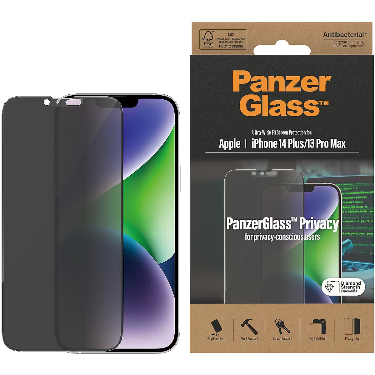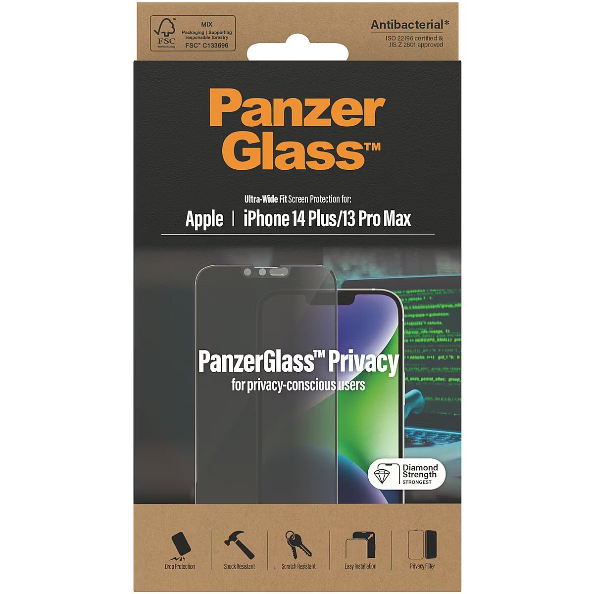 LongSummaryDescription - PanzerGlass ® Privacy Screen Protector iPhone 14 Plus | 13 Pro Max | Ultra-Wide Fit. Brand compatibility: Apple, Compatibility: Apple - iPhone 14 Plus, Apple - iPhone 13 Pro Max. Dry application. Protection features: Scratch resistant, Shock resistant, Anti-bacterial. Privacy filtering function, Material: Tempered glass, Polyethylene terephthalate (PET), Silicone, Product colour: Transparent. Quantity per pack: 1 pc(s)