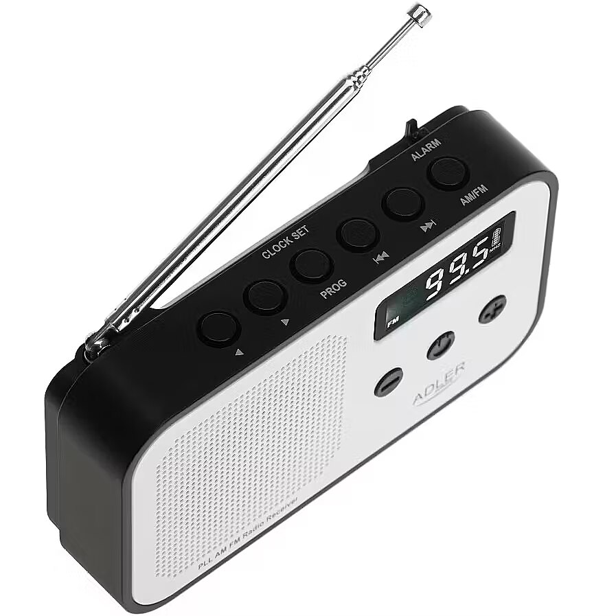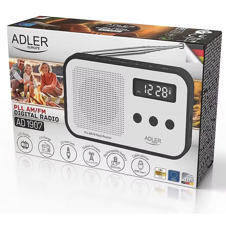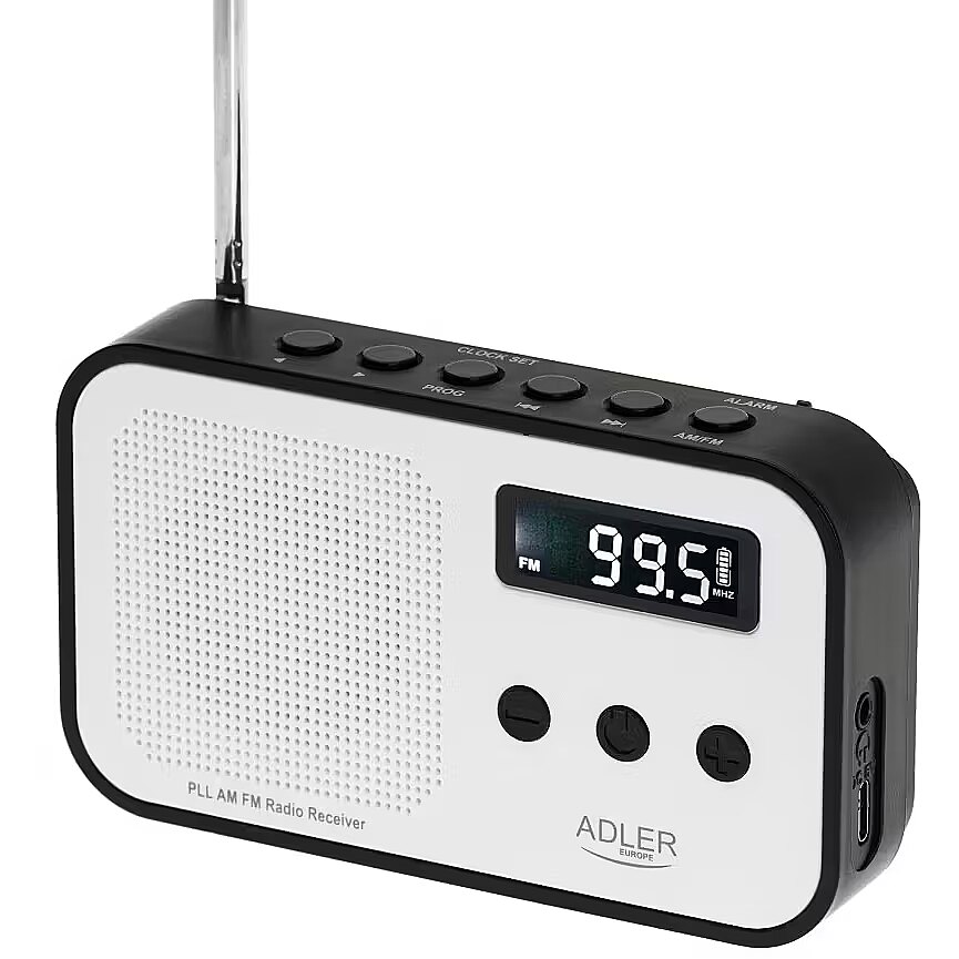 Aprašymas - „Adler AD 1907“ – tai kompaktiškas ir modernus PLL AM/FM skaitmeninis radijas, pasižymintis puikia garso kokybe ir patogiu valdymu. Automatinė PLL derinimo sistema leidžia tiksliai ieškoti stočių, o platus dažnių diapazonas užtikrina mėgstamų laidų priėmimą tiek FM, tiek AM juostose. Pagrindinės savybės: Automatinė PLL derinimo sistema – greita ir tiksli stočių paieška Platus dažnių diapazonas: FM: 87,5–108 MHz AM: 522–1620 kHz 40 stočių atmintis – 20 FM ir 20 AM Aiškus LCD ekranas – lengvas valdymas ir naudojimas Teleskopinė antena – pagerina signalo priėmimą ir garso kokybę Įmontuotos funkcijos: Laikrodis Žadintuvas Atidėjimas Miego režimas 3,5 mm ausinių lizdas – klausymuisi vienam Optimalus išėjimo galingumas: 0,6 W – aiškus ir ryškus garsas Įmontuota 600 mAh baterija – ilgesnis naudojimas be įkrovimo Modernus USB-C įkrovimas – greitas ir patogus maitinimas