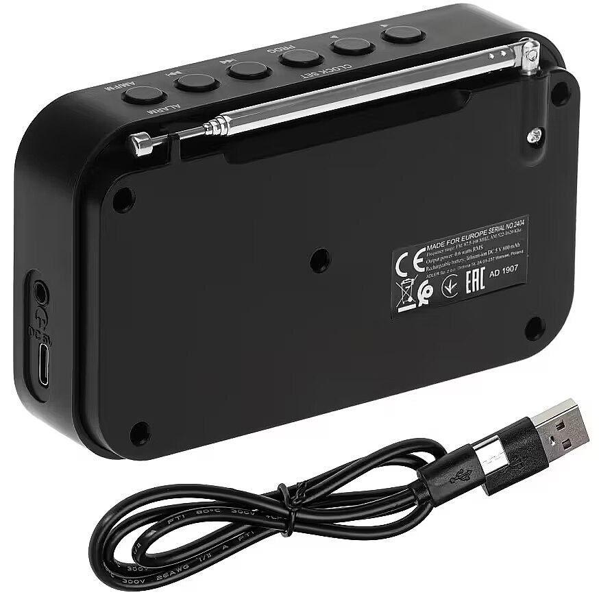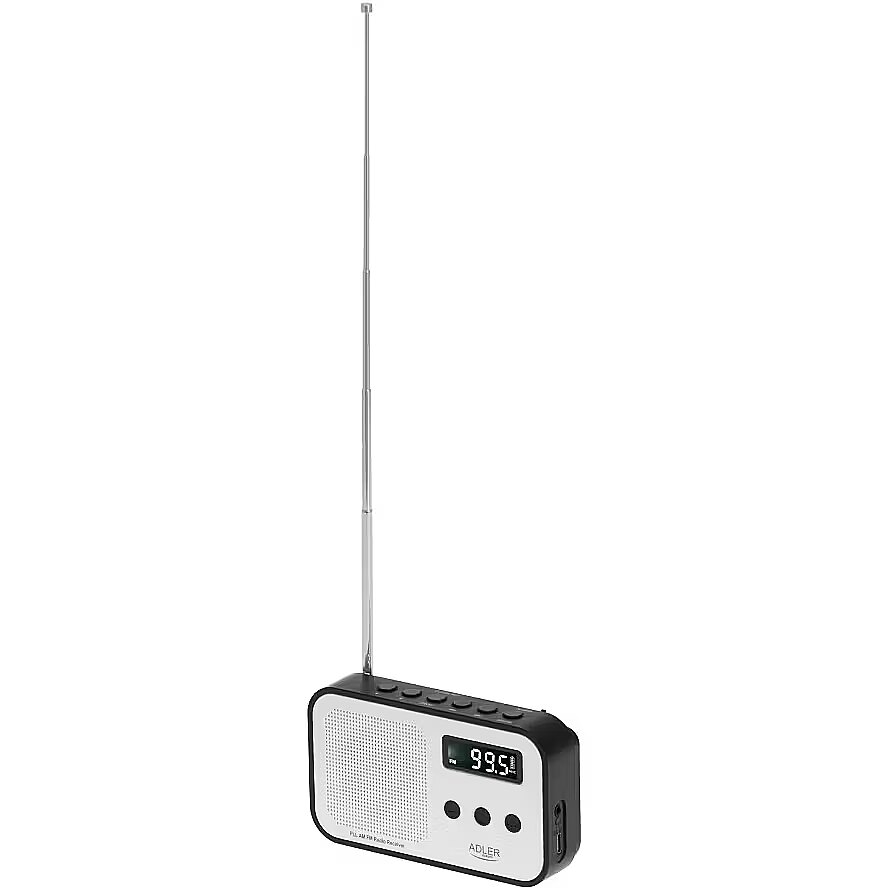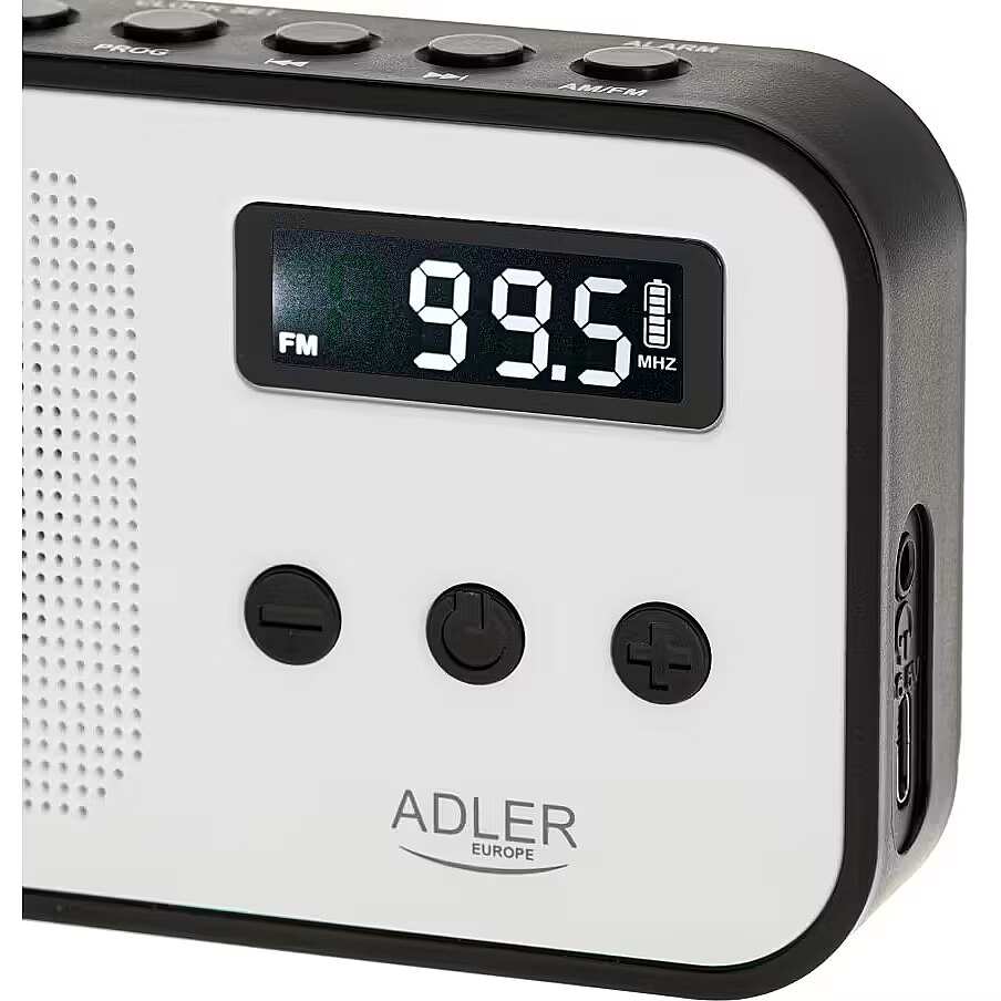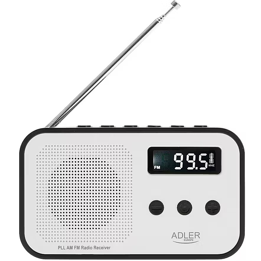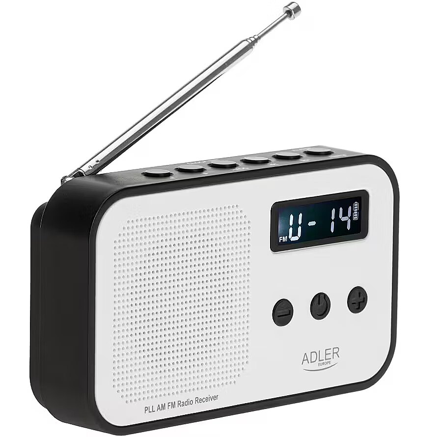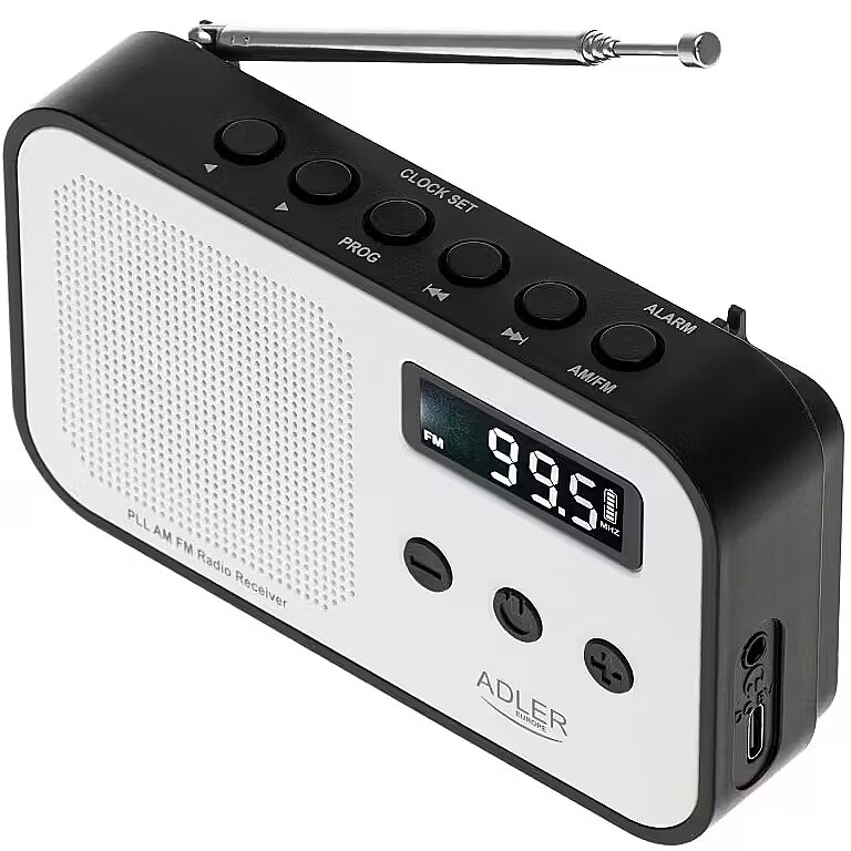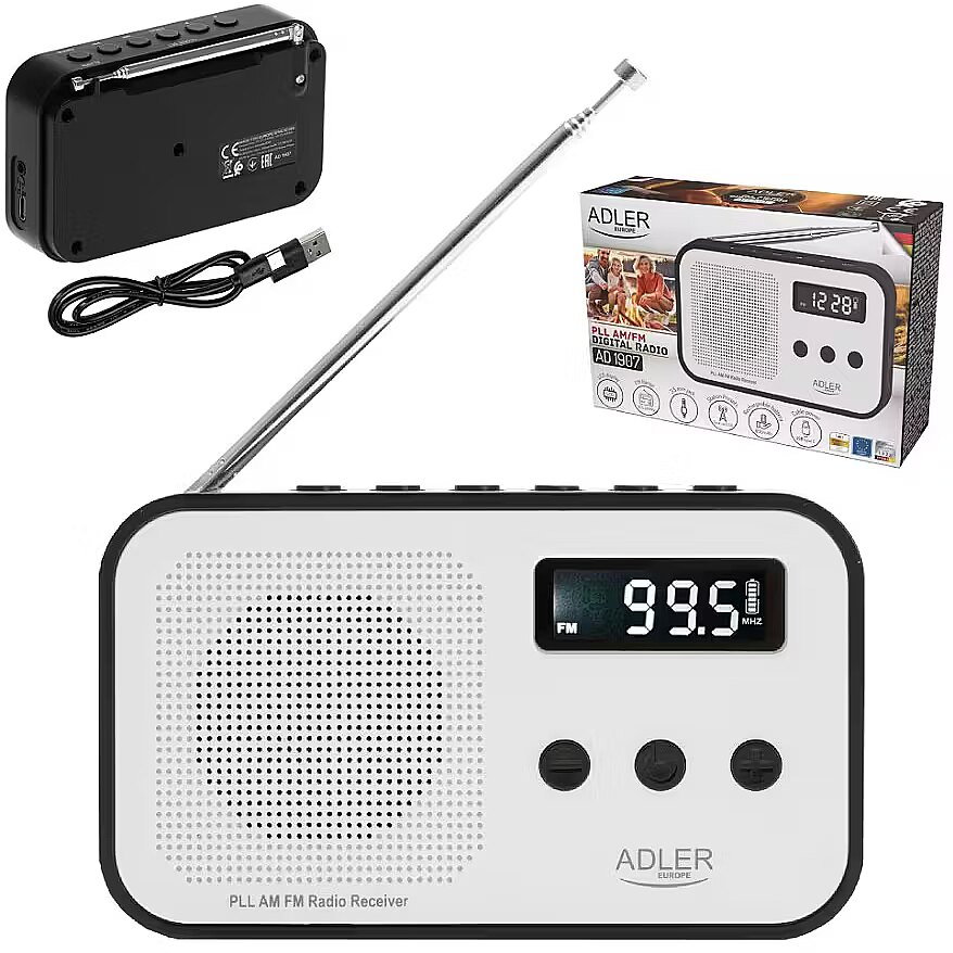 Description - The Adler AD 1907 is a compact and modern PLL AM/FM digital radio, offering excellent sound quality and user-friendly operation. With its automatic PLL tuning system, it allows precise station searching, while the wide frequency range ensures reception of your favorite programs on both FM and AM bands. Key Features: Automatic PLL tuning system - fast and accurate station search Wide frequency range: FM: 87.5 - 108 MHz AM: 522 - 1620 kHz Memory for 40 stations - 20 FM and 20 AM Clear LCD display - easy control and operation Telescopic antenna - improves signal reception and enhances sound quality Built-in functions: Clock Alarm Snooze Sleep mode 3.5 mm headphone jack - for private listening Optimal output power: 0.6 W - clear and crisp sound Built-in 600 mAh battery - longer usage without recharging Modern USB-C charging - fast and convenient power supply