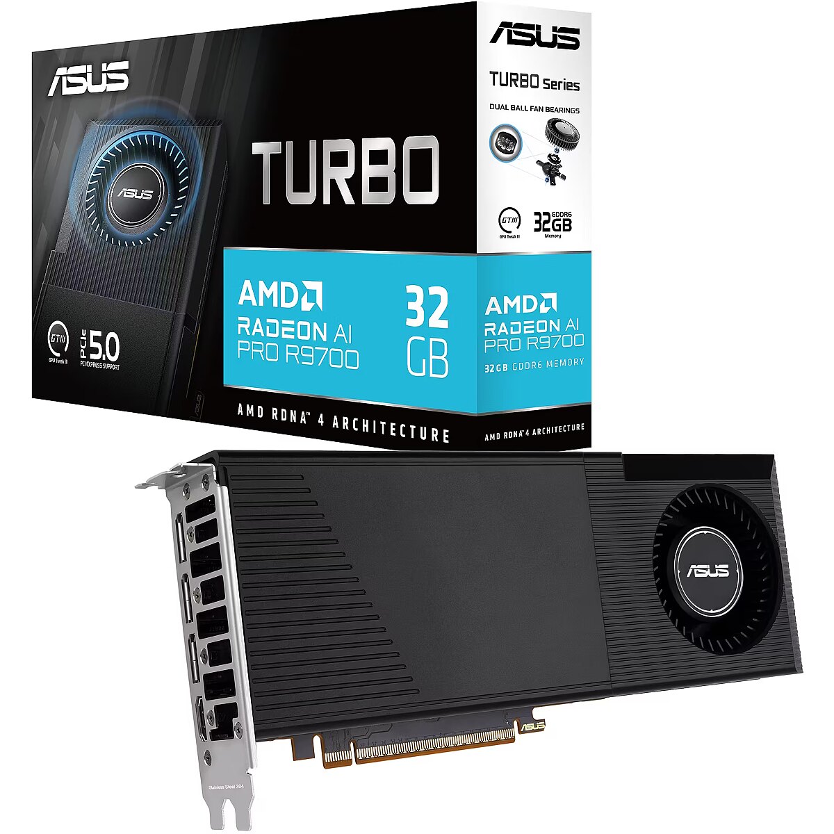 LongSummaryDescription - ASUS Turbo -AI-PRO-R9700-32G. Graphics processor family: AMD, Graphics processor: Radeon AI PRO R9700. Discrete graphics card memory: 32 GB, Graphics card memory type: GDDR6, Memory bus: 256 bit. Maximum resolution: 7680 x 4320 pixels. OpenGL version: 4.6. Interface type: PCI Express 5.0. Cooling type: Active, Number of fans: 1 fan(s)
