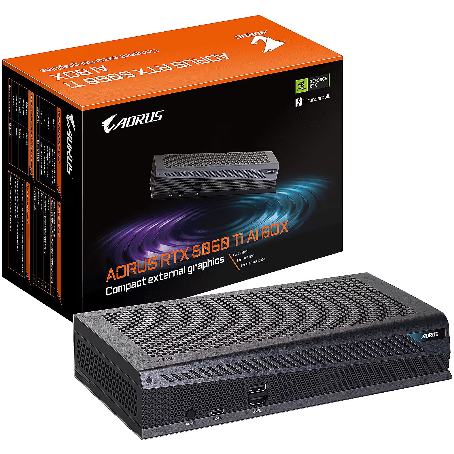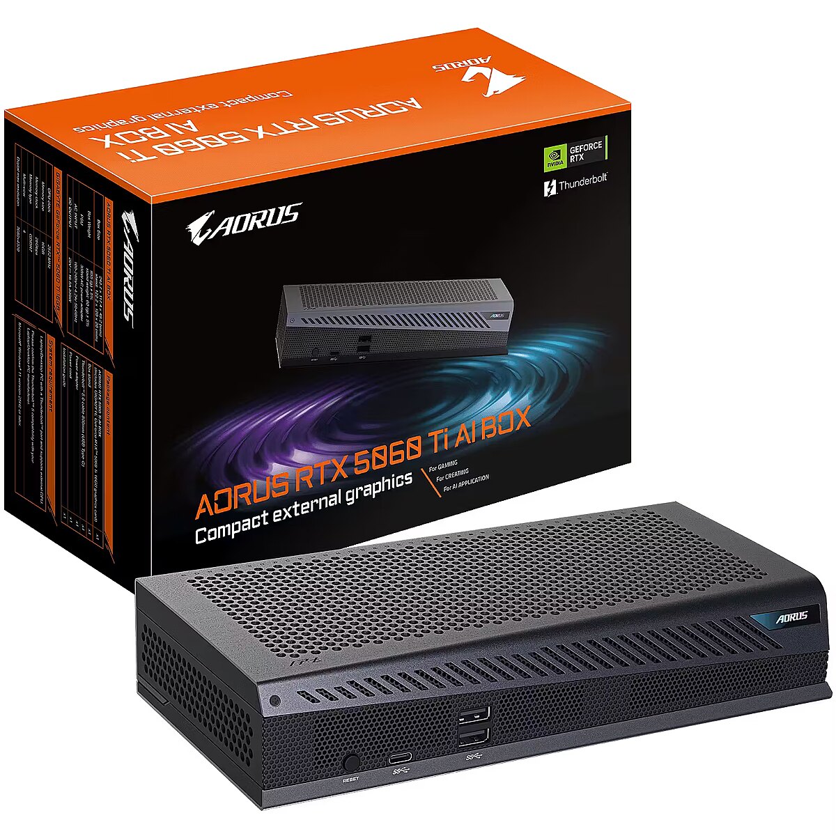 LongSummaryDescription - GIGABYTE AORUS RTX 5060 Ti AI BOX Graphics Card - 16GB GDDR7, 128bit, PCI-E 5.0, 2572MHz Core Clock, 3 x DP 2.1, 1 x HDMI 2.1, GV-N506TIXEB-16GD. Housing colour: Black, Number of graphics cards supported: 1 pc(s). Graphics processor family: NVIDIA, Graphics processor: GeForce RTX 5060 Ti, Maximum resolution: 7680 x 4320 pixels. Width: 243.7 mm, Depth: 48.2 mm, Height: 117.4 mm. Cables included: AC, Thunderbolt. Power supply: 330 W, AC input voltage: 100 - 240 V, AC input frequency: 50 - 60 Hz