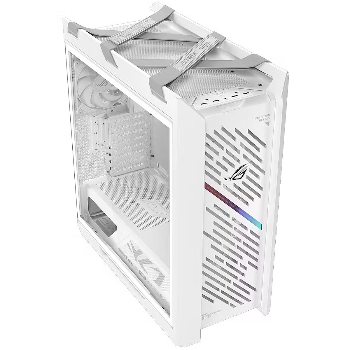 LongDesc - ROG Strix Helios II EATX mid-tower gaming case with dual tempered glass side panels, GPU support for up to 450mm in length, aluminum frame and front panel, GPU braces and 420mm radiator supportROG Strix Helios IIStriking Looks. Cool Moves.ROG Strix Helios II is a premium mid-tower gaming case featuring dual tempered glass side panels, a refined aluminum frame, and a diamond grille front panel with a 3D-structured front filter. It comes pre-installed with four 140 x 28 mm performance fans, delivering optimized airflow and enhanced thermal performance for demanding gaming setups. Engineered for expandability and performance, it's ready for motherboards ranging from ITX to EATX and serious water-cooling setups as well - making it the perfect choice for a classic ROG showcase build.Premium Design & AestheticsROG Strix Helios II is made for showcase builds with dual 4mm-thick tempered glass side panels fitted in a refined brushed-aluminum frame. The aluminum front panel, featuring a diamond grille design, is manufactured using high-precision CNC milling technology and an anodizing process. The diagonal slashes on the front are inspired by race car elegance and individuality to make the Helios II unique. With rounded edges, a streamlined shape and hidden seams, this chassis is sleeker than ever.Four Pre-Installed Performance FansThe Helios II is designed to balance performance and acoustics: Four pre-installed 140mm fans with 28mm frames deliver strong airflow while maintaining a low 29 dB(A) noise level.Ready For High-Performance Builds With Dual AIO SupportThe ROG Strix Helios II is built to perform and primed for expansion, with ample space for GeForce RTX™ 5090 graphics cards or hardcore water-cooling setups. It can handle a ROG Ryuo IV SLC 360 ARGB AIO cooler and the 360mm radiator of the ROG Astral LC GeForce RTX 5090 at the same time. It features support for radiators up to 420mm in the front and 360mm at the top, with room reserved for installing the pump and reservoir of a custom loop.Easy Installation & MaintenanceROG Strix Helios II is designed with multiple mechanisms to provide the smoothest building experience, even for DIY novices. Meanwhile, keeping your rig clean is made easy with built-in dust filters and easy access to all areas.Tool-Free Side Panel DesignPushing a button at the rear of the case releases one of the side panels for tool-less access to the interior. Its tempered glass is hinged on the bottom to swing away and rest at an angle, or you can remove the panel completely and set it aside while you tinker.Modular Fan & Radiator MountsTwo removable brackets let you easily mount fans and radiators before installing the whole assembly into the case, simplifying your building experience.Patented Graphics Card Slot ClampA tool-free graphics card slot clamp makes your PC building faster and hassle-free with a simple snap that secures your GPU firmly in place.Rear Detachable PSU BracketFor easier installation, a rear bracket detaches from the case so that a power supply can slide right in.Dust FiltersThe 3D-structured front filter provides ample space for the front fans while providing optimized airflow and acoustics. It combines forces with removable filters on the top and underside to provide all-round protection from dust, making cleaning and maintenance easier.Effortless Cable ManagementKeep your build sharp and tidy with flexible covers and a comprehensive cable management system. A cable grommet channel features velcro to let you neatly organize two sets of cables.A multifunction cover with graphics card braces cleverly hides cabling while providing sturdy support to graphics cards. Its position can be adjusted to accommodate an ATX or EATX motherboard.Front I/O PanelThe Helios II includes two USB 20Gbps Type-C ports with support for 60-watt fast charging where compatible.ARGB Lighting ControlThis LED-lit button toggles an integrated ARGB controller that supports Aura Sync lighting, enabling vast customization of colors and effectsPremium Fan Speed ControlPWM controls fan speeds automatically, making it easy to switch between light and heavy airflow as needed.Ergonomic Case StrapsEasily carry your prized build to LAN parties with ergonomically X shape woven fabric straps that combine style and comfort, rigorously tested to support up to 50kg for reliable transport.ROG ElementThe front panel, Velcro straps and drive cage all feature the distinctive ROG logo, communicating futuristic luxury and elegance.