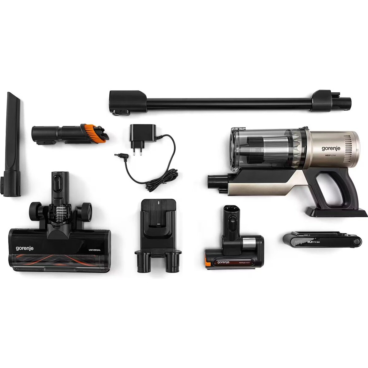LongSummaryDescription - Gorenje SVC259441NFGO. Product type: 2-in-1 stick vacuum, Dust container type: Bagless, Product colour: Gold. Wheels material: Rubber. Cleaning type: Dry, Vacuum air filtering: HEPA, Dirt separating method: Multi cyclonic. LED indicators: Battery level, Charging. Power source: Battery, Maximum input power: 350 W, Battery technology: Lithium-Ion (Li-Ion)