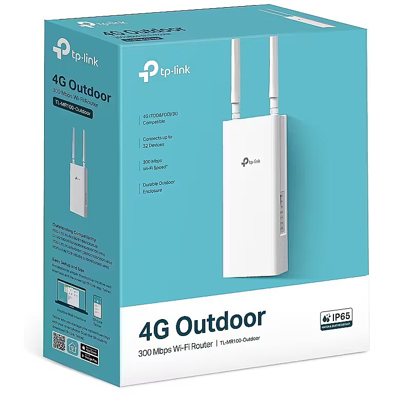 Aprašymas - TP-LINK TL-MR100 300 Mbps belaidis N 4G LTE maršrutizatorius Pažangiausias 4G tinklas Dalinkitės interneto prieiga su 32 "Wi-Fi" įrenginiais ir mėgaukitės iki 150 Mbps atsisiuntimo sparta TL-MR100- Outdoor 4G 300 Mbps Wi-Fi lauko maršrutizatorius 4G LTE ir greitas "Wi-Fi" greitis: palaiko iki 150 Mbps LTE ir iki 300 Mbps "Wi-Fi" 2,4 GHz dažniu * Patvarus lauko korpusas: IP65 apsauga nuo atmosferos poveikio** ir ±6 kV apsauga nuo žaibo ir ±15 kV apsauga nuo ESD§. Įvairūs montavimo būdai: Lankstus ir patogus naudojimas: lengvai montuojama bet kur, naudojant stulpą, sieną ar langą. PoE/DC maitinimo šaltinis: palaiko 802.3af ir pasyvųjį PoE, todėl jį lengva įdiegti. Prijunkite ir naudokite: Įjunkite SIM kortelę, kad bet kur galėtumėte iškart naudotis internetu. Supaprastinta sąranka: Lengvai nustatykite ir valdykite tinklą naudodami "Tether" programėlę.