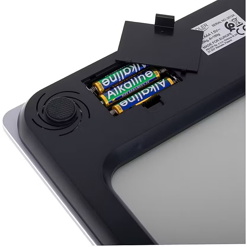 Kitos funkcijos > Kitos funkcijos - Grūdinto stiklo platforma: Maitinimas: baterija 3x1,5 V (AAA); 6 mm; išsikrovusio akumuliatoriaus ir perkrovos indikatorius; maitinimas: baterija 3x1,5 V (AAA)