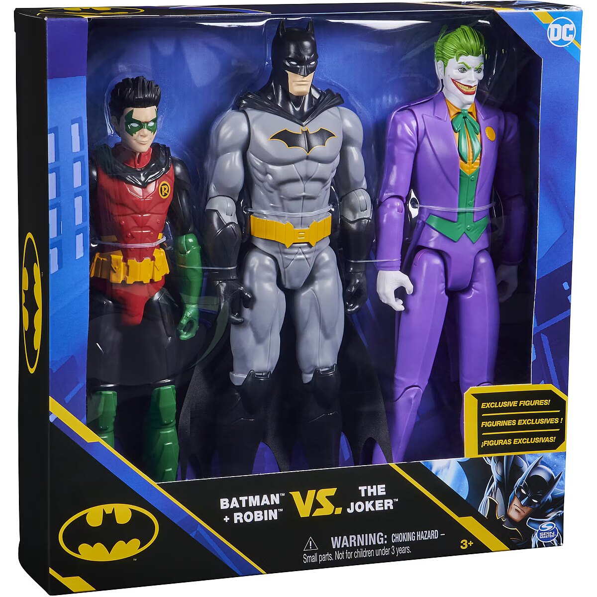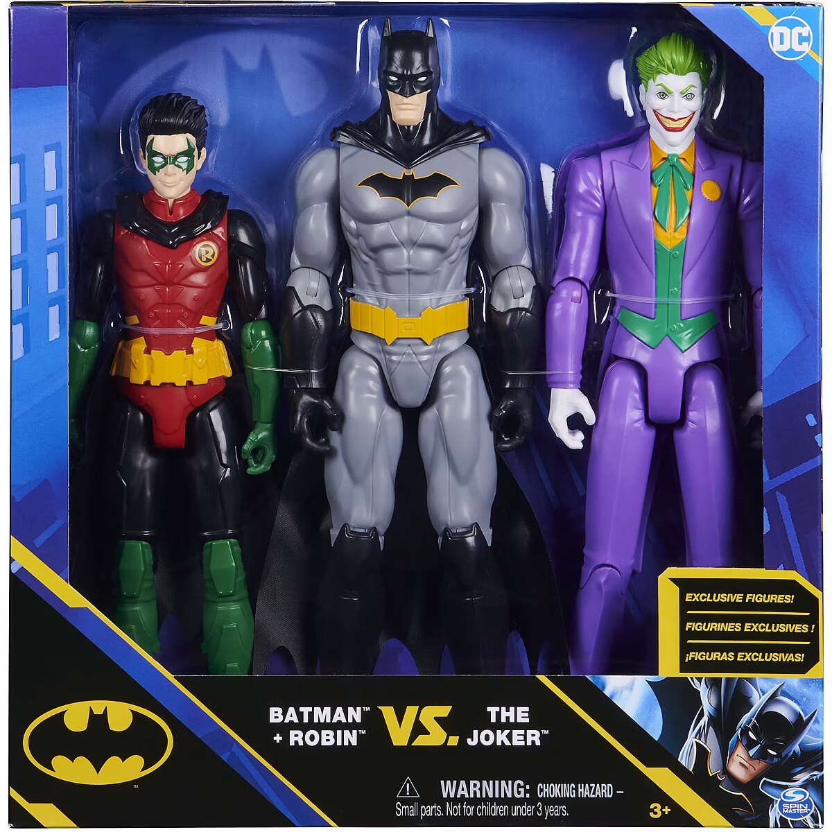 LongDesc - Create your own epic Batman adventures with the Batman 12-inch Action Figures! This 3-Pack includes Batman, Robin and The Joker! Each action figure features 11 points of articulation, a cloth cape (on Batman and Robin) and detailed comic styling that brings your favorite Batman characters to life! Team up with Batman and Robin to fight The Joker! Help rid Gotham City of its most sinister Super-Villains! Engage your imagination and pose your action figures as you play out your own Batman storylines and battles! With a range of 12-inch figures to collect, expand your Batman action figure collection with Batman, Robin, the Joker (sold separately) and more! Bring home your favorite characters with the Batman 12-inch Action Figures 3-Pack!