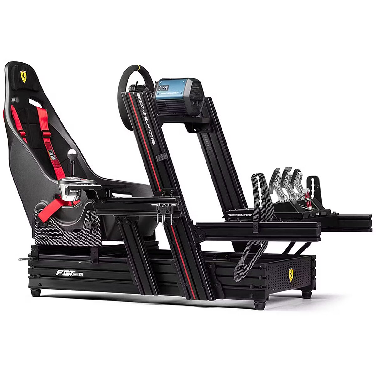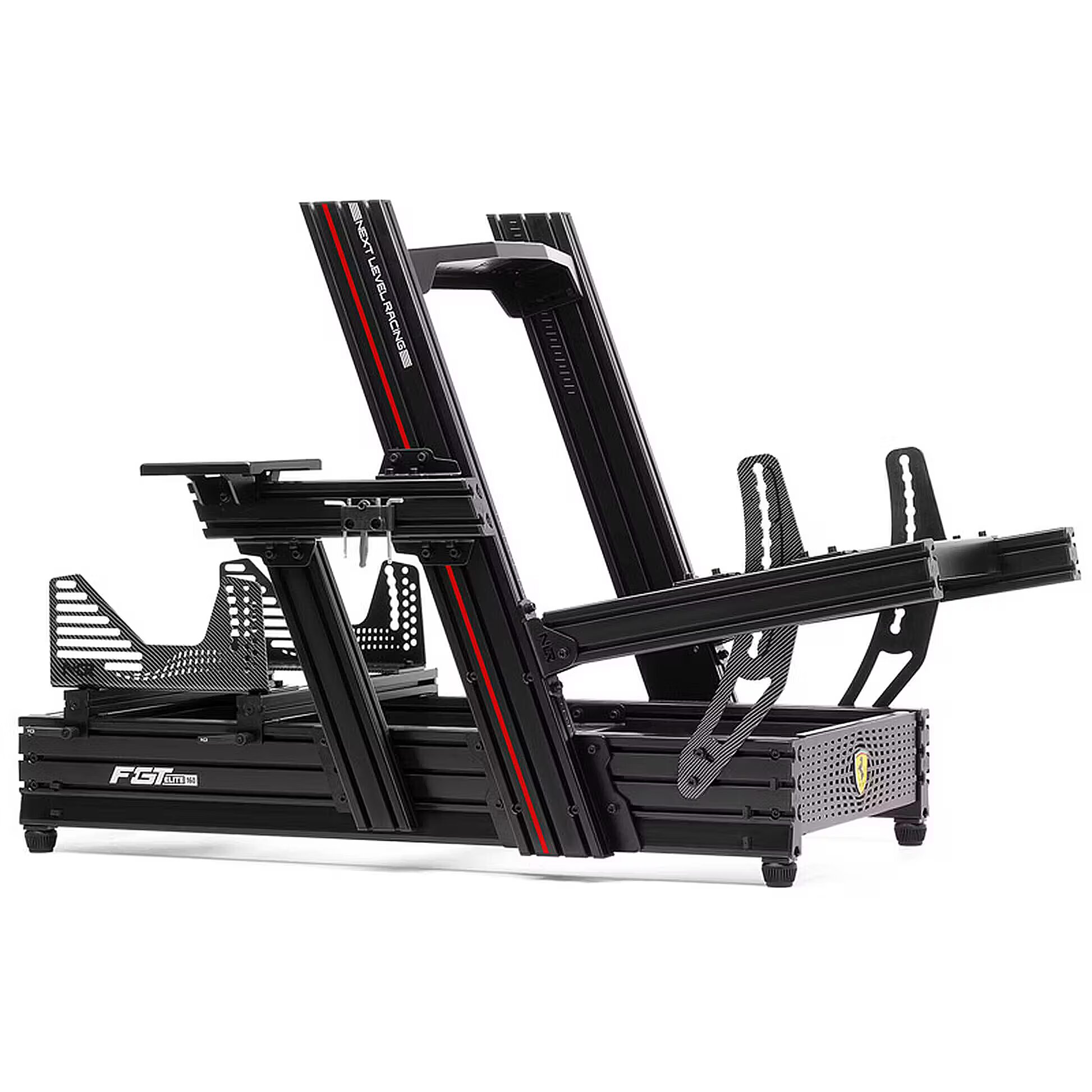 Description - F-GT Elite 160 Scuderia Ferrari edition The ultimate, uncompromising all-in-one aluminium profile 160 racing cockpit for elite racing drivers. High quality black anodised aluminium profile with high quality powder coated carbon steel components and pre-machined holes for ease of assembly and rigidity. Compatible with Next Level Racing* motion platforms. Industry standard extruded aluminium construction with Next Level Racing custom end caps and T-Slot nuts, Next Level Racing Flex-Free seat sliders and Next Level Racing custom shoulder bolts. Official Ferrari licensed product. Offers multi-position driving ergonomics in formula, hybrid, GT, truck and tank. Pre-drilled for universal compatibility with major steering wheel, pedal, gear lever and handbrake manufacturers. Custom 160mm x 40mm NLR aluminium profile base for strength and rigidity. In collaboration with Ferrari, the Next Level Racing F-GT Elite 160 Scuderia Ferrari Edition is the ultimate Scuderia Ferrari racing simulator cockpit. Adorned with the prestigious Scuderia Ferrari Racing Shield, the F-GT Elite 160 Scuderia Ferrari Edition is true to its name and is made for the elite. In collaboration with Ferrari, the F-GT Elite 160 Scuderia Ferrari Edition is designed for drivers who demand the highest quality and uncompromising rigidity for the ultimate Scuderia Ferrari sim racing experience. The Next Level Racing F-GT Elite 160 Scuderia Ferrari Edition completes the Scuderia Ferrari brand experience for fans of the legendary brand and is unrivalled when it comes to deflection-free, high-quality aluminium extrusion simulation cockpits. The F-GT Elite 160 Scuderia Ferrari Edition sets the standard for quality and rigidity from the highest quality anodised high-grade aluminium to the powder-coated carbon steel components. Nothing was spared in the design and construction thanks to the almost infinite possibilities for adjustment and customisation, even the most demanding racing drivers will feel right at home in the F-GT Elite 160 Scuderia Ferrari Edition cockpit. The F-GT Elite 160 Scuderia Ferrari Edition cockpit is also compatible with the Next Level Racing Motion Ecosystem*. Featuring industry-leading materials combined with precise adjustments and compatibility, the F-GT Elite 160 Scuderia Ferrari Edition offers the most immersive premium simulation on the market. *Next Level Racing F-GT Elite 160 is compatible with Next Level Racing Motion Platform V3, Motion Plus Platform. Users can attach two Motion Plus platforms. Users who want to attach the Traction Plus Platform to the cockpit need the Next Level Racing Elite Motion Adapter Upgrade Kit. THE BEST OF THE BEST There should be no compromise when it comes to premium simulation cockpits, and the F-GT Elite 160 Scuderia Ferrari Edition is just right for the Elite user. The F-GT Elite 160 Scuderia Ferrari Edition is the perfect choice for elite users who demand the best. Boasting unparalleled rigidity, innovation, quality and almost infinite adjustability, this product offers the complete package for an ergonomic Formula, GT, hybrid, truck and tank driving position. Experience the ultimate racing simulation setup with the Next Level Racing F-GT Elite 160 Scuderia Ferrari Edition. GET TO KNOW THE BRAND Next Level Racing is proud to announce our latest collaboration with Ferrari, introducing the F-GT Elite 160 Scuderia Ferrari Edition. Drawing inspiration from Scuderia Ferrari's rich motorsport history, this cockpit features replicated carbon fibre prints for a stunning aesthetic finish that will make you feel like you're sitting in a real Ferrari. The Scuderia Ferrari Racing Shield on the frame and custom front grill complete the cockpit look and enhance the overall styling. The red Ferrari accent on the cockpit is the perfect finishing touch. Combined with the Next Level Racing ES1 Scuderia Ferrari Edition seat, the F-GT Elite 160 Scuderia Ferrari Edition cockpit provides a fully immersive racing experience that will put you in the driver's seat of a race car. With this product, we have provided a complete brand experience for Ferrari enthusiasts who enjoy simulations, allowing them to immerse themselves in the world of racing like never before. Get ready for the excitement of Scuderia Ferrari racing in the comfort of your own home. FULL OF INNOVATION AND QUALITY The innovative Next Level Racing Seat Slider System has been designed and engineered to eliminate the deflection problem found in conventional seat sliders used in simulations. Next Level Racing custom detents are used to easily move the seat back and forth to find the perfect racing position without bending. The Next Level Racing seatposts are constructed from 5mm carbon steel to provide the stiffness required for high-end racers, and the new design offers more adjustability than ever, supporting multiple seating positions with 98 adjustment options. The Next Level Racing ES1, ERS1 and ERS2 seats are recommended for use with Elite cockpits as they have been designed and optimized for the most demanding users. DESIGN MEETS POWER The F-GT Elite 160 Scuderia Ferrari Edition excels in a world of aluminum cockpits where quality and durability are often compromised. This unique product features an inflexible aluminum extrusion and a custom 160mm x 40mm Next Level Racing profile for unparalleled strength for the cockpit base. With the F-GT Elite 160 Scuderia Ferrari, users can confidently enjoy a truly multi-position Formula, Hybrid and GT driving cockpit without sacrificing design or durability. The F-GT Elite 160 has a high-quality thick-walled profile and a custom 160mm x 40mm profile for the base of the cockpit, with a total weight of 60kg. This custom shape of the base profile provides extra strength and refined aesthetics. The precision-engineered multi-folding wheel, pedal, and plates combine with thick carbon steel to eliminate flex and flex, providing a stronger and stiffer platform for users to mount th