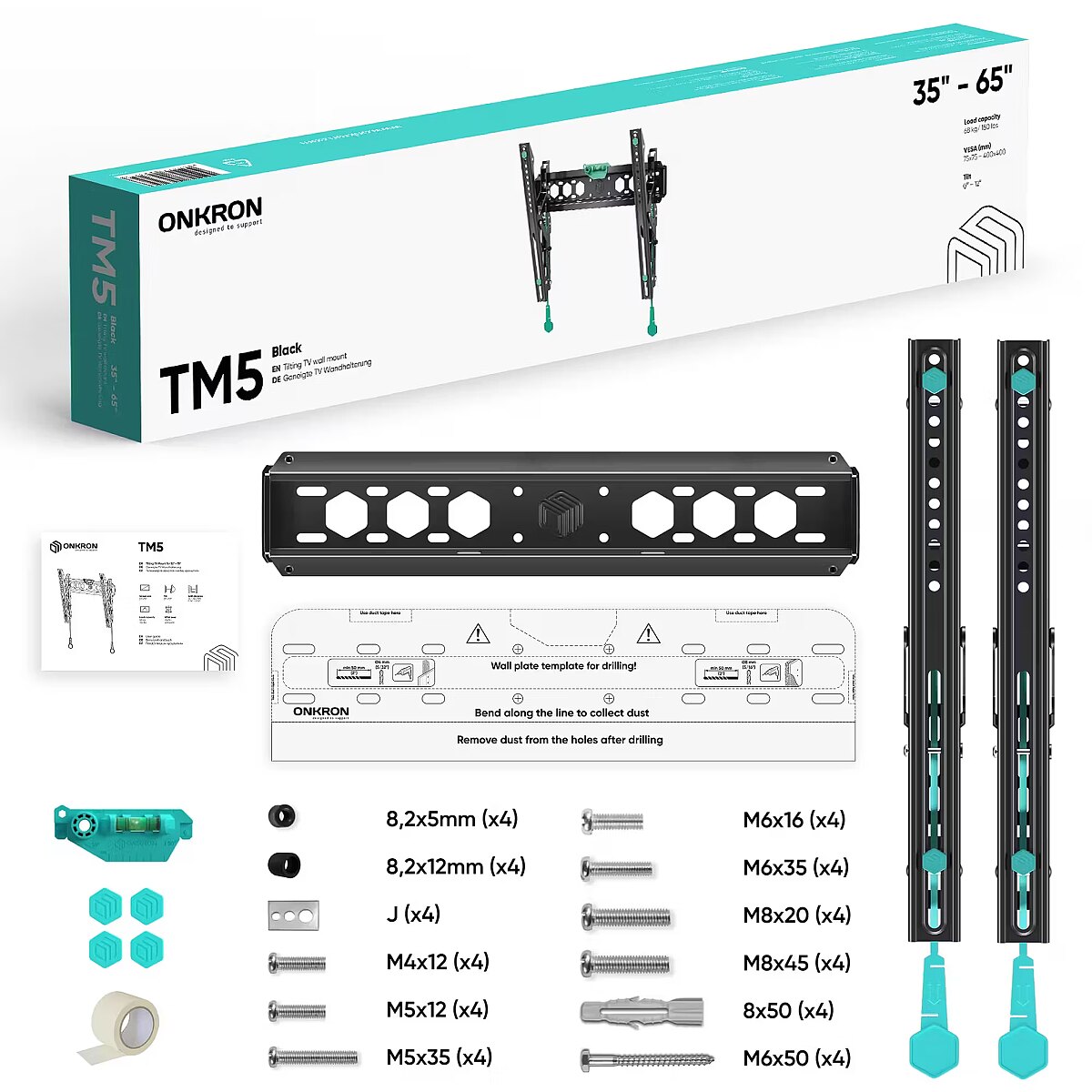 Summary - ONKRON TM5-B. Maximum weight capacity: 60 kg, Minimum screen size: 81.3 cm (32"), Maximum screen size: 177.8 cm (70"), Minimum VESA mount: 75 x 75 mm, Maximum VESA mount: 400 x 400 mm. Tilt angle range: 0 - 12°, Distance to the wall (min): 3.5 cm, Distance to the wall (max): 14.5 cm. Product colour: Black