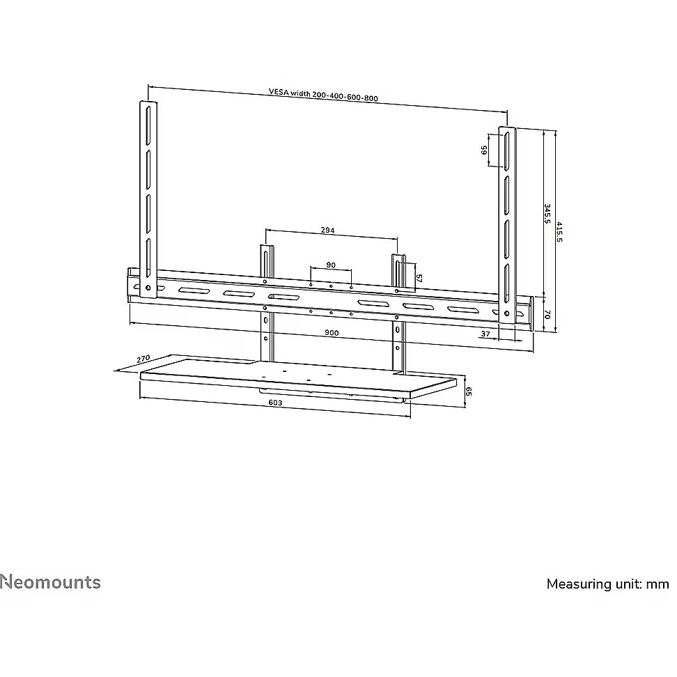 LongDesc - The Neomounts AV40-500BL is a universal keyboard shelf kit designed for installation beneath displays from 43" and larger, supporting VESA hole patterns from 200x200 up to 800x600 mm. Featuring a shelf size of 27x60,3 cm and a maximum load capacity of 2,5 kg, it offers ample space for both keyboard and mouse.For optimal flexibility, both the shelf support and backplate brackets are height adjustable. The AV40-500BL mounting holes allow width and height variations, while the VESA frame adjusts in four positions (200/400/600/800). The kit is compatible with both wall and floor mounts. Installation is quick and straightforward, with ruler-guided alignment ensuring a precise and seamless fit.For detailed compatibility with specific models and mounting sizes, please consult the online manual.