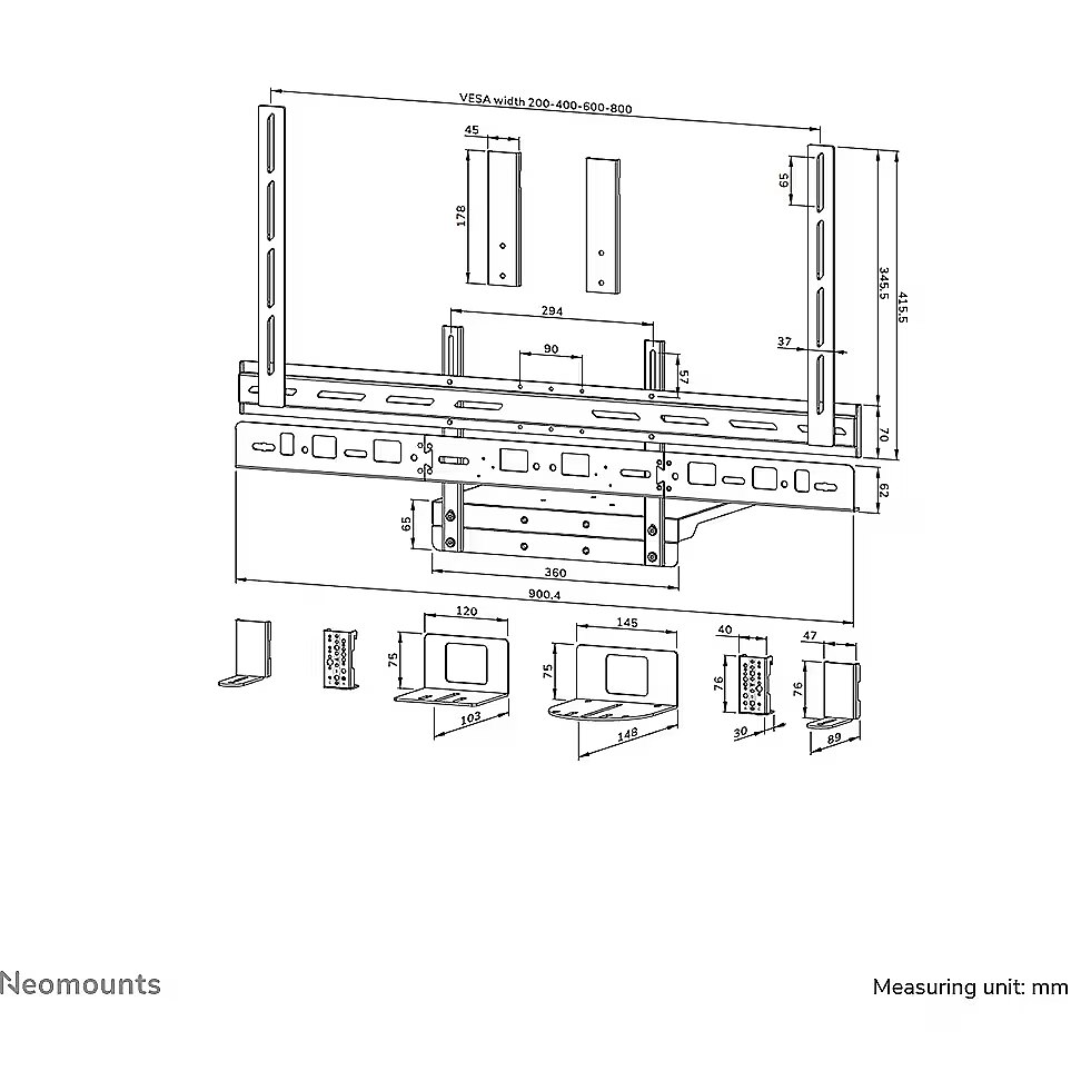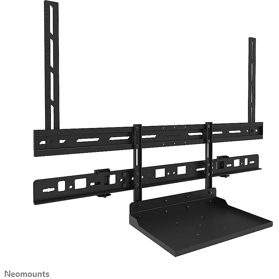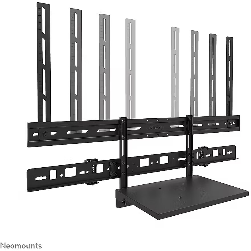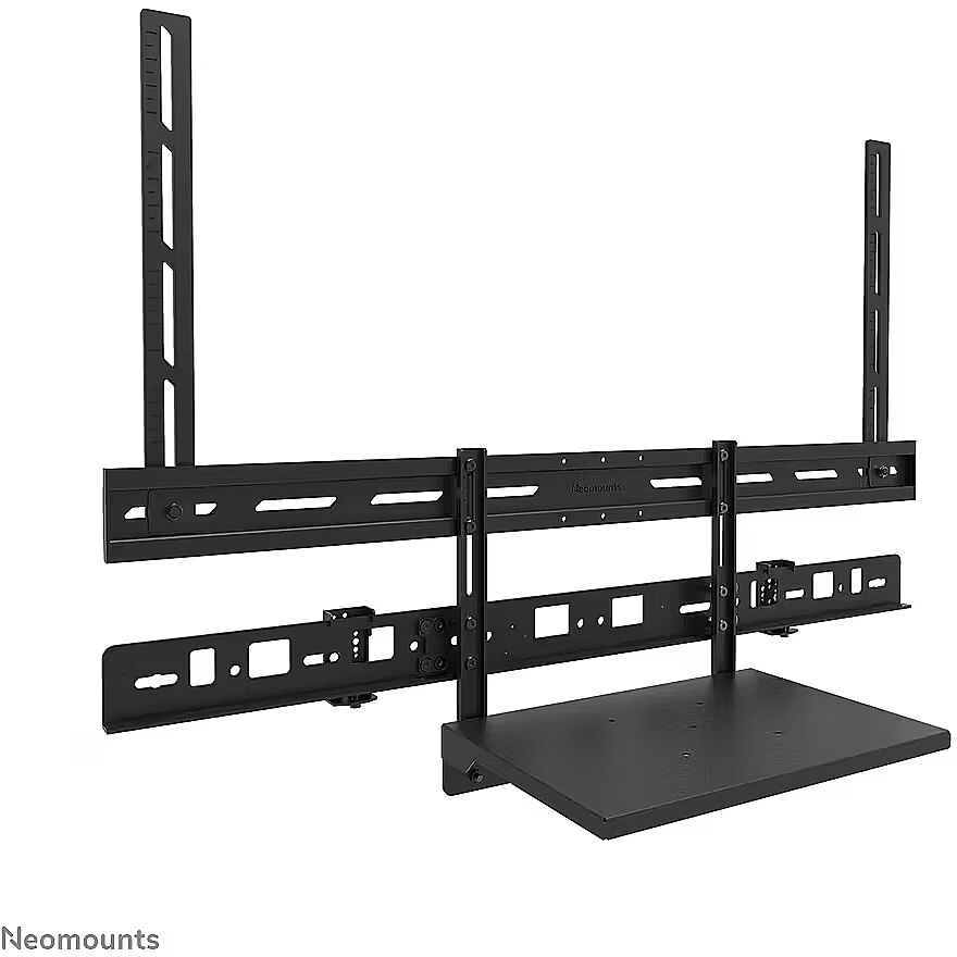 LongDesc - The Neomounts AV60-500BL is a universal videobar and laptop shelf kit designed for 43" displays and larger, supporting VESA hole patterns from 200x200 up to 800x600 mm. Built for durability and versatility, the kit supports devices up to 8 kg and can be installed either above or below the screen. The included laptop shelf carries up to 2,5 kg providing a smart solution for laptops, notebooks, tablets or extra equipment. Both the videobar/laptop support and the backplate brackets are height-adjustable, offering maximum flexibility.Compatible with most* videobars, PTZ cameras, and soundbars, including Logitech Rally speakers, the AV60-500BL ensures broad applicability. The mounting holes allow width and height variation, while the VESA frame adjusts in both height and width (200/400/600/800). The kit is compatible with both wall and floor mounts. Despite its versatility, installation is straightforward, aided by ruler-guided alignment for a seamless fit.* The AV60-500BL is truly universal, compatible with any videobar that fits within the bracket?s range (see line drawing). It is also specially designed for the following models:- Bose Professional VB1 and VB-S- Neat Bar (gen 1, gen 2) and Bar Pro- Poly Studio USB, Studio R30/X30/X32, Studio X50/X52/V52, Studio X70/X72/V72 and Studio V12- Jabra Panacast 40/50- Logitech Meetup, Meetup 2, Rally Bar, Rally Bar Mini, Rally Bar Huddle and Rally Plus- Cisco Webex Room Kit Plus- Yealink MSpeaker II, MeetingBar A30/A40/A50, UVC20/UVC30 Room/UVC34/UVC40 and MeetingEye 400/600- AVer VB350 and VB370A- Barco ClickShare Bar (Pro)- Maxhub Xbar U50/V50/W70 and UC S05/S07/S10/S10 Pro/S15- Predia Connect Camera- Biamp Parlé ABC 2500(a), VBC 2500(a)/2800 and SBC 2- Lenovo ThinkSmart OneFor detailed compatibility with specific models or mounting sizes, please refer to the online manual.