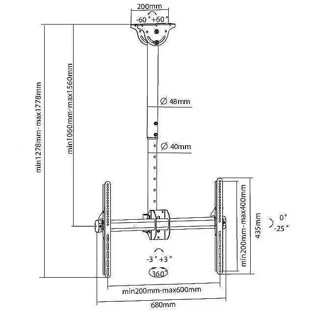 LongSummaryDescription - "Techly" 37-70 teleskopinis ilgas lubų laikiklis LED LCD televizoriui" ICA-CPLB 946L. Didžiausias leistinas svoris: 50 kg, Mažiausias ekrano dydis: 94 cm (37"), Didžiausias ekrano dydis: 177,8 cm (70"), Mažiausias VESA tvirtinimas: 200 x 200 mm, Didžiausias VESA laikiklis: 200 x 200 mm, Didžiausias VESA laikiklis: 600 x 400 mm. Aukščio reguliavimo diapazonas: 1060-1560 mm, pakreipimo kampo diapazonas: -25-0°, pasukimo kampas: 180°. Produkto spalva: juoda