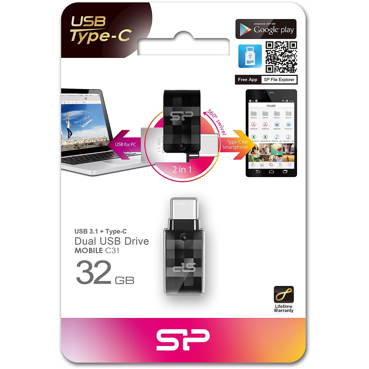 Naujasis C31 pritaikytas abiem atvejais. Dėl dviejų sąsajų - USB-A ir USB-C - jis užtikrina sklandų ir greitą duomenų perdavimą tarp tradicinių kompiuterių su USB ir naujausios kartos USB-C įrenginių. Greitai ir lengvai bendrinkite savo failus arba atlaisvinkite vertingą atminties vietą išmaniajame įrenginyje. C31 - viena mažytė atmintinė, jokių kabelių, jokios netvarkos, jokių tinklo apribojimų - kartais gyvenimas gali būti toks paprastas! Būkite vienu žingsniu priekyje su USB-C Ar jums labiau patinka klasikinės, ar naujausios technologijos? Nesvarbu - USB-C sparčiai plinta ir yra universali ateities sąsaja. USB-C yra grįžtamoji, o tai reiškia, kad ji visada veikia iš pirmo karto. Išlikite prisijungę ir būkite žingsniu priekyje su naujuoju C31! Pasukite ir naudokite - paprastas ir patogus 360° kampu besisukantis dangtelis išties praktiškas - jis niekada netrukdo, nepasimeta ir visada apsaugo nenaudojamą galą. Be to, dangtelis turi stilingą deimantais raštuotą apdailą, todėl yra dar elegantiškesnis. Tikra klasika! Deimantinio rašto dizainas ir atitinkamo dydžio COB (angl. Chip on Board) technologija užtikrina, kad C31 yra kompaktiškas ir mažas, o kartu apsaugotas nuo vandens, vibracijos ir dulkių. Bendrovė "Silicon Power" taip tiki savo atmintukų patvarumu, kad suteikia 5 metų garantiją. SP File Explorer - tvarkykite failus išmaniai ir nemokamai Sukurtas specialiai USB-C įrenginiams ir "Android™" išmaniesiems telefonams bei planšetiniams kompiuteriams, SP File Explorer siūlo automatinį failų skirstymą į kategorijas ir itin patogų atsarginių kopijų darymo vienu mygtuku sprendimą.