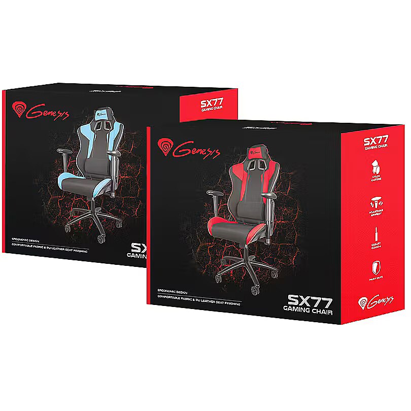 LongDesc - GENESIS SX77Every experienced player knows, that his comfort is one of the most important things, which he should take care of. Long-lasting, exciting gameplay can be a real effort, and for that reason every gamer should look after his body’s wellness.The first step should be securing the spine, which could be easily achieved by investing in good, properly contoured gaming chair. The Genesis SX77 is a chair, which will provide maximum comfort for every single gamer, even the most demanding one.THE DURABILITYThe structure of the SX77 was made with high-quality, durable metal. The chassis made with that material guarantees high resistance to damages and ensures long years of operation.Moreover, the frame of chair contains the class 4 gas lift, which is able to bear up to 150 kilograms. Thanks to those solutions, the SX77 is very good choice for almost every single gamer.MORE FUNCTIONALITYThe SX77 characterises combination of high comfort with many functionalities. The product offers the seat’s height regulation in a range of 8-10 centimetres, as well as armrests regulation, which can be tilted to the left or right. Another interesting functionality is ability to swing on the chair, which recently is gaining in popularity.Furthermore, the SX77 has adjustable backrest angle, which would be really appreciated among the gamers, who sometimes need some rest or a nap during the long-lasting gameplay.MAXIMUM COMFORTThe seat’s upholstery is filled with high-quality, soft foam, which is 2.5 centimetres thick in the backrest and 4 centimetres in the seat. Moreover, both the seat and the backrest are properly profiled to ensure maximum comfort and to support the gamer’s spine.The SX77 is covered with a matt, durable, nylon material in the front part and high-quality eco leather in the rear. In addition, there are two soft cushions – one as a head rest, and the other one with the adjustable straps, to support appropriate part of the spine and improve the comfort.ATTENTION TO DETAILThe real gamer’s throne has to look outstanding. The Genesis SX77 is available in two colour versions: black and red, and black and blue.Such a choice of colours, connected with a leather trim, and a leather back in black carbon style, gives the seat an aggressive, gaming character. You will stand out at every LAN tournament with the SX77!