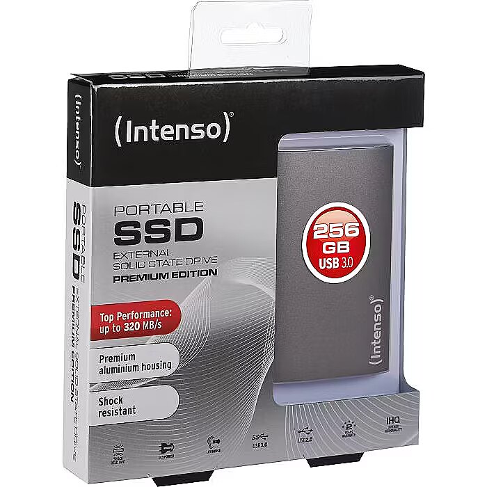 Summary - Intenso 256GB Premium. SSD capacity: 256 GB, SSD form factor: 1.8". USB connector: Micro-USB B, USB version: 3.2 Gen 1 (3.1 Gen 1). Read speed: 320 MB/s, Write speed: 100 MB/s. Product colour: Anthracite