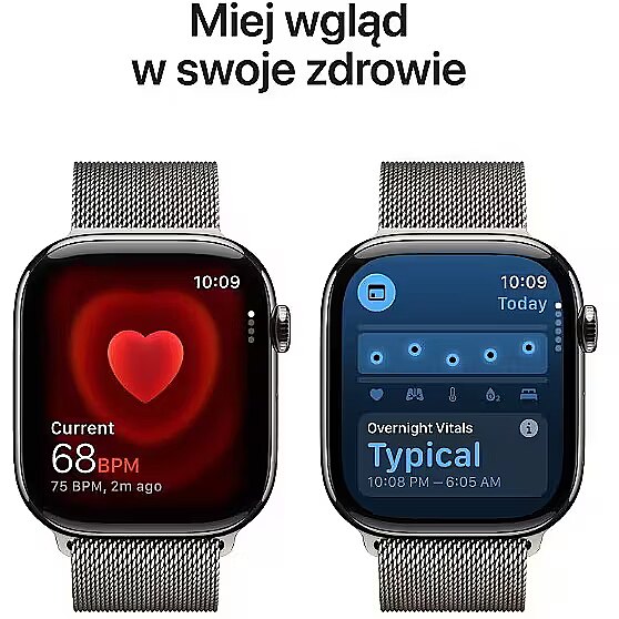 Description - Get to know it from every angle Refined design. The Series 11 is the slimmest Apple Watch. You can comfortably wear it all day, even while sleeping, which makes monitoring vital signs easier. Greater battery performance. Tireless battery, sufficient for up to 24 hours of normal use on a full charge. And up to 8 hours with just 15 minutes of charging. Advanced sensors. When it comes to health, you can always keep your finger on the pulse. The Apple Watch Series 11 uses innovative sensors, including two that measure heart rate and wrist temperature. Durable IonX display. The Series 11 display is twice as scratch-resistant as the Series 10 display and ready for everything the day brings. Water and dust resistance. The Apple Watch Series 11 has a WR 50M water resistance rating, making it perfect for the pool or sea up to 6 meters deep. And the IP6X standard makes it completely dustproof. About your heart health The more you know about your health, the more effectively you can take care of it. With the Apple Watch Series 11, you get a fuller picture. With apps like ECG and Vital Signs, you can monitor your condition in real time. And the groundbreaking High Blood Pressure Notifications feature is invaluable for heart health prevention. High Blood Pressure Notifications High blood pressure affects over 1.3 billion people worldwide and is a leading cause of heart attack, stroke, or kidney disease. It shows no symptoms, so it often goes undiagnosed. It can even be missed during a doctors visit, because usually only one blood pressure measurement is taken. To receive high blood pressure notifications, you only need to wear the watch for a minimum of 30 days. The Series 11 will let you know if it detects symptoms of possible high blood pressure. How does it work? The optical sensor collects data, which is then analyzed by an algorithm for possible hypertension. To do this, it checks the response of blood vessels to heartbeats over a 30-day period. A completely new perspective. Solid scientific basis. High Blood Pressure Notifications is a groundbreaking feature created using advanced machine learning methods and a series of scientific studies. Over 100,000 people participated in these studies. The final step was testing the feature in clinical trials. Your blood pressure log. After receiving a high blood pressure notification, you can start keeping a log of measurements in the Health app on your iPhone. You will need a blood pressure monitor for this. Your log will make communication with your doctor easier. More health-supporting features Check your sleep quality first thing in the morning. Sleep quality is influenced by factors like duration, consistent bedtime, number of awakenings, and time spent in each sleep phase. The Sleep Score feature analyzes these factors every night and presents a summary in the morning in an easy-to-read report. This way, youll know exactly what affects your sleep quality and how to make it more restorative. Dont ignore sleep apnea. It involves repeated episodes of stopped breathing during sleep. Untreated sleep apnea can increase the risk of high blood pressure, type 2 diabetes, heart disease, and other health problems. The Series 11 monitors breathing disturbances during sleep and alerts you to possible sleep apnea. Vital Signs app. Get insight into your daily health at a glance. You can quickly check data recorded overnight, including heart rate, respiratory rate, wrist temperature, blood oxygen, and sleep duration. You will also receive a notification if values fall outside normal ranges. ECG app. Heart in the palm of your hand. The ECG app in Series 11 can detect signs of atrial fibrillation and irregular heart rhythms. Measurements are taken directly from the wrist in a similar way to a single-lead electrocardiogram. With the Heart Rate app, keep your finger on the pulse. You can check it anytime. Youll also receive notifications if your heart rate is too high or too low, or if arrhythmia occurs. Cycle Tracking keeps you up to date. Every menstrual cycle is different. By observing yours, youll better understand its rhythm. The Cycle Tracking feature lets you record your period and accompanying symptoms. Youll receive a predicted date for your next period and fertile days. The feature will also notify you of unusual cycle patterns. Estimated ovulation time based on previous data. The Series 11 has an advanced sensor that monitors your temperature while you sleep. The Cycle Tracking app uses this data to determine the probable ovulation time. This information is extremely helpful for family planning. Blood oxygen measurement. A breathtaking innovation. The Apple Watch Series 11 is equipped with a sensor and app that measure blood oxygen both when you want to check and in the background, day and night. Who knows the results, gets results Whether you want to improve your treadmill or swimming performance, the Apple Watch Series 11 will help you train in countless ways. The device tracks every movement, analyzing many useful parameters. Because the more you know, the more you achieve. Sounds clever? Lets get started! Begin your workout with one click. Refreshed Workout app. Surprising in form. Its improved interface includes four new corner buttons, providing faster access to features like Base Pace, Route Race, and Custom Workout. Complete another lap of your Activity Rings. Move, Exercise, Stand. In the Activity app, the ring-closing animation reflects your movement. You can also pause rings and adjust your goals for each day of the week. Supports runners at every level No matter your running goals, the Apple Watch helps you achieve them easily. Durable battery, precise GPS, and motivating features that allow real-time tracking give you the perfect start. Time for your new personal record. Training load at a glance. With helpful analyses, youll better understand how workout intensity affects your body. Youll know when to push harder and when to rest.