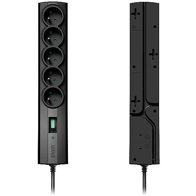 Description - The new CLASSIC surge protector provides effective protection to the connected household or office devices against surges in the mains. The protector is dedicated for devices such as desktop PCs and notebooks, peripherals, audio/video and multimedia devices. The protector features five grounded mains sockets with Child Protection system, preventing children from tampering with live elements. The protector's other functions include an LED indicating whether the surge protection is active, an automatic fuse for quick and easy re-activation of the protector and an illuminated, two-pole switch. DESCRIPTION Five grounded mains sockets. All sockets have interlocks that prevent children from accessing live components (Child Protection System). Automatic fuse - for restarting the protector in case of short circuit or overload, once the cause of the fault has been removed. Signaling of correct operation of the surge protection feature (LED). Illuminated, two-pole mains switch secured against accidental triggering. Holders for fixing the protector to the wall (fixing template can be downloaded from www.ever.eu). The power cord can be placed in various directions.