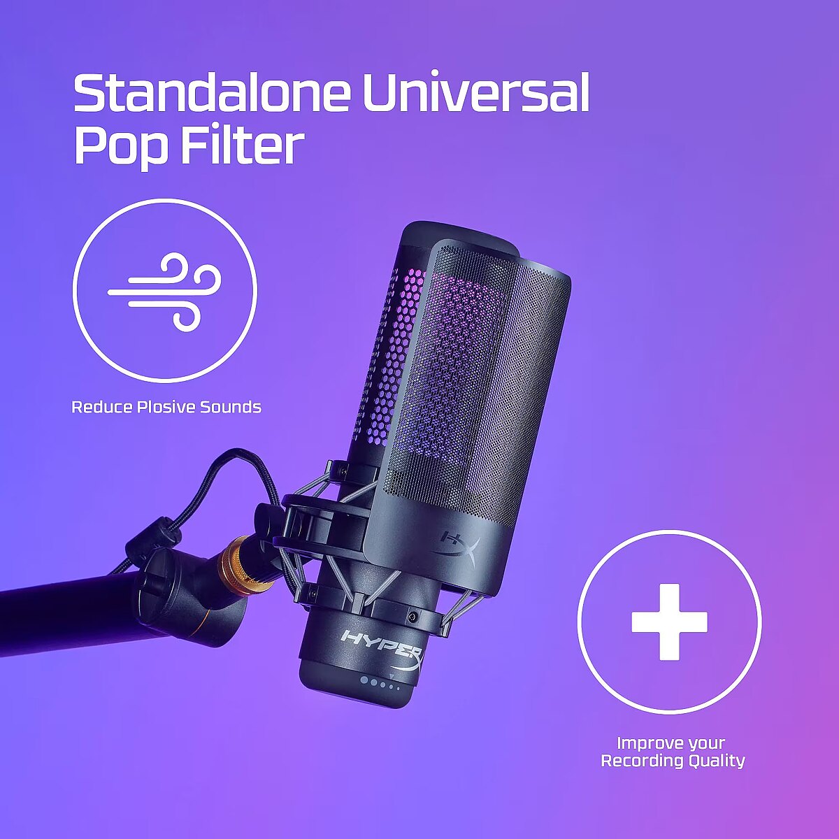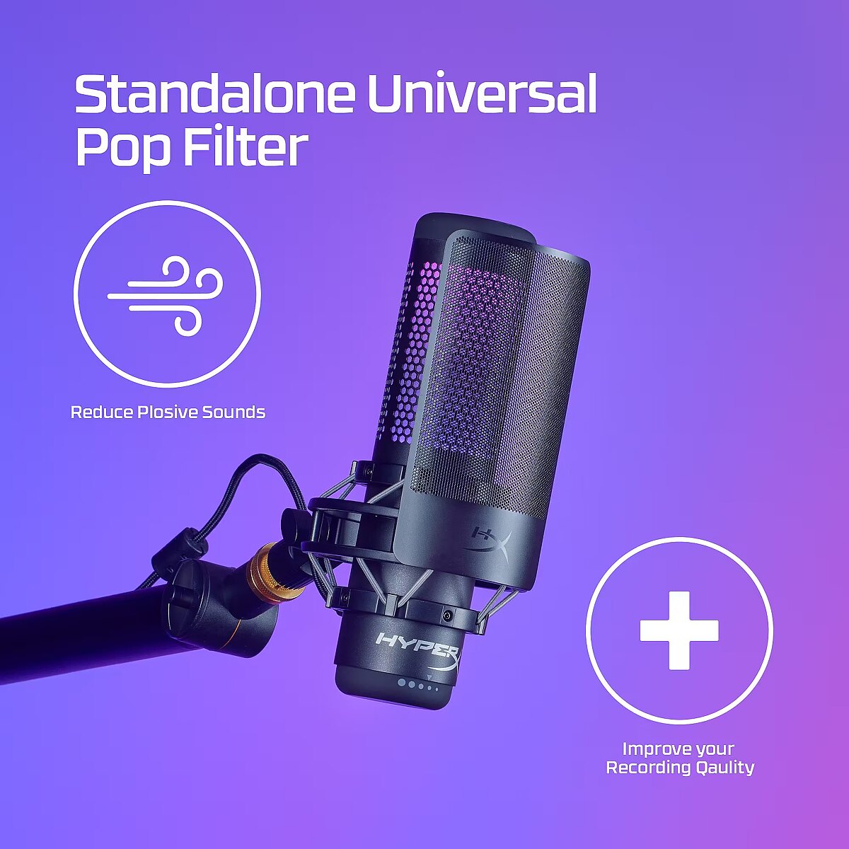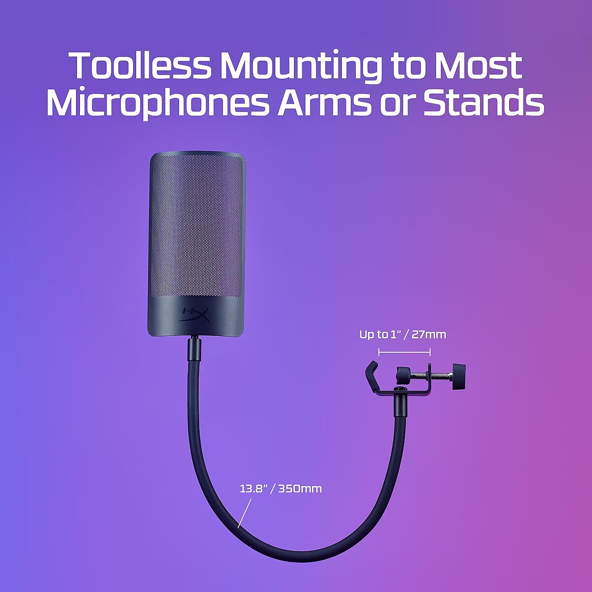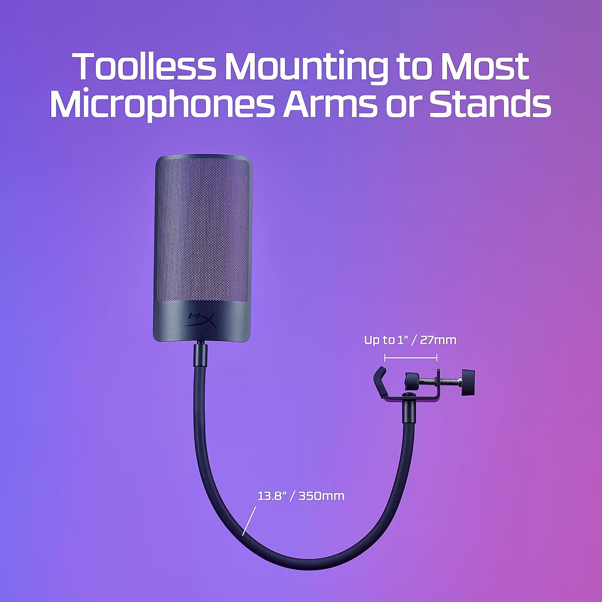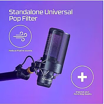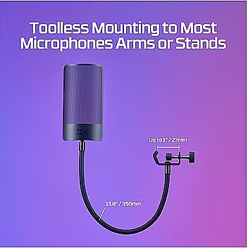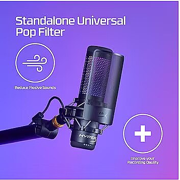 LongDesc - Clean up your recording.If you’re a streamer, content creator, or aspiring voiceover artist, the HyperX Shield Microphone Pop Filter will help clean up your audio and improve your recordings. This useful microphone accessory can help filter out plosive puffs of air. It features a universal clamp and a flexible silicone gooseneck that easily attach to most microphone setups. For HyperX QuadCast, QuadCast S, and ProCast owners, it’s even easier, simply detach the gooseneck, and directly attach the filter to the shock mount.