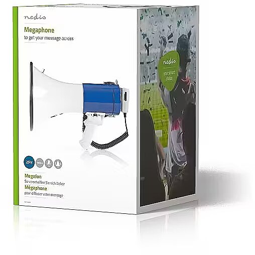 description_en - Su šiuo galingu "Nedis®" megafonu su įmontuota sirena perduokite savo žinią didelei auditorijai. Jis ypač veiksmingas per didelio masto renginius, evakuacijas ir kitais atvejais, kai reikia kreiptis į didelę minią. Reikia kalbėti ilgesnį laiką? Tiesiog pakabinkite megafoną ant peties su pridedamu dirželiu, nuimkite mikrofoną ir naudokite jį laikydami rankose. Savybės - 1500 m perdavimo nuotolis dėl integruoto 25 W stiprintuvo - Peties dirželis ir nuimamas mikrofonas, kad būtų dar patogiau - Įmontuota sirena, kad iš karto atkreiptumėte dėmesį - Reguliuojamas garsumas D 8x D/LR20 tipo akumuliatorius