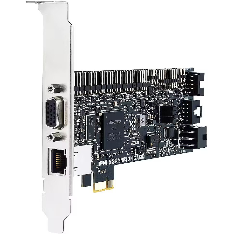 LongDesc - ASUS IPMI expansion card with dedicated Ethernet controller, VGA port, PCIe 3.0 x1 interface and ASPEED AST2600A3 chipset to provide the intelligence for IPMI architectures