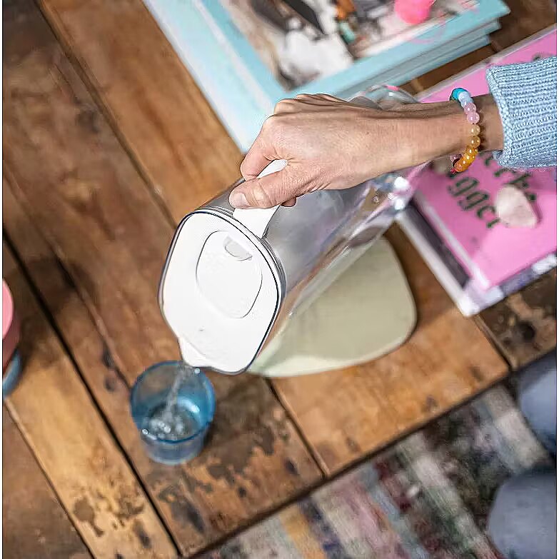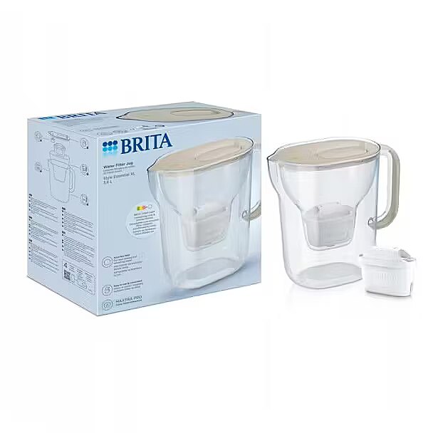 Description - Water Filter Jug Style Essential 3.6L sandy Easy-to-use water filter jug: stylish, easy to fill with one hand thanks to the lid with a flip-top water inlet, and dishwasher-safe (except for the Smart Light LED indicator). A practical spout cover protects the water from contamination. Do you drink a lot of water? Choose the XL capacity: 3.6 L (2.3 L filtered water capacity). PURE PERFORMANCE for a taste free from unwanted substances (e.g., chlorine) as well as fine particles or micro-contaminants. Quality and design: made in Germany, using expertise developed since 1966.