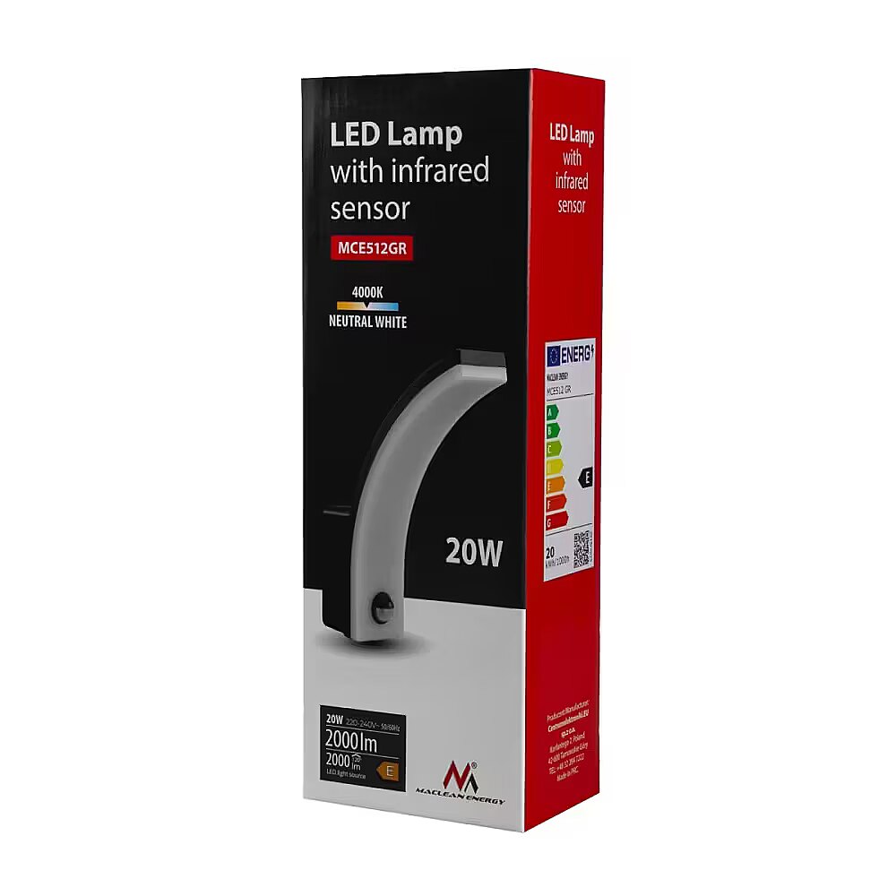 Other features - - Manufacturer: Maclean - Model: MCE512 GR - Dimensions: 25 cm (height), 18.8 cm (width), 6.6 cm (depth) - Color: gray - Voltage: 220-240 V/AC - Power frequency: 50/60 Hz - Power: 20W - Energy class: E - Ambient light: < 3 to 2000 LUX (adjustable) - Adjustable lighting time: min. 10 sec. +/- 3 sec; max. 15 min. +/- 1 min. - Detection range: 140° - Detection distance: max. 9 m - Operating temperature: -20 - +40°C - Permissible humidity: < 93% - Mounting height: 1.8 to 2.5 m - Speed of detected motion: 0.6 to 1.5 m/s - Luminous flux: 2000 lm - Color temperature: 4000K (neutral white) - Protection class: IP65 - Construction material: plastic - Lifetime: 25000 hours - Illumination angle: 120° - Minimum distance of light source from illuminated objects: 0,5 m