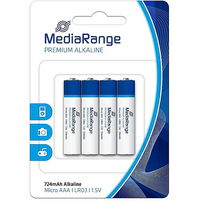 Description - MediaRange Premium Alkaline Batteries, Micro AAA|LR03|1.5V, Pack 4 MediaRange premium alkaline batteries are perfect for devices with high power consumption and continual use. The state-of-the-art alkaline technology provides maximum quality and supplies your devices with continuous power.