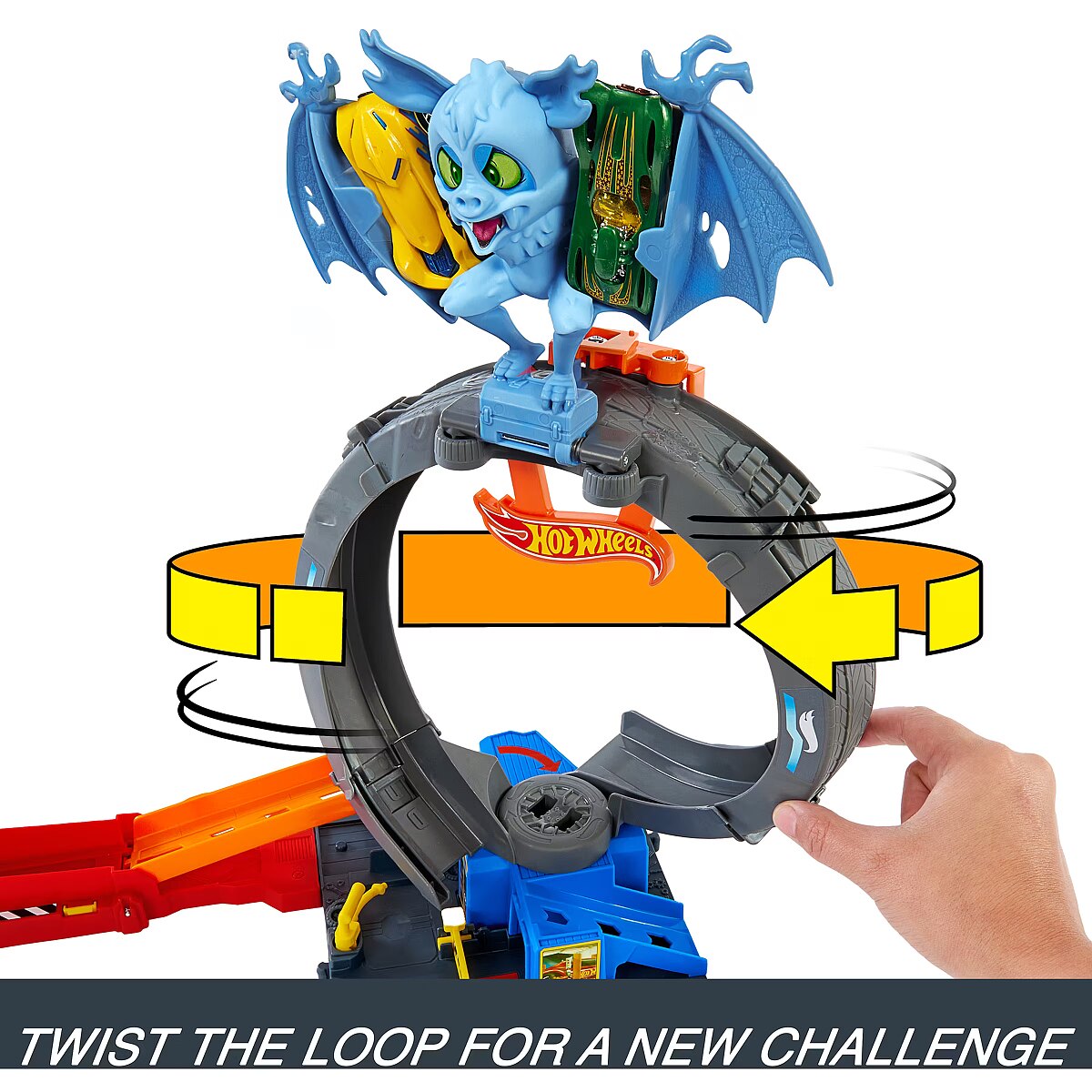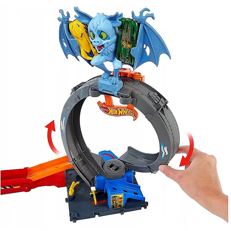 LongDesc - Laukinis šikšnosparnis užpuolė "Hot Wheels City" padangų parduotuvę kaip "Netflix" seriale "Lenktynės", todėl jį išnaikinti turi puikius akrobatinio triuko įgūdžius turintys vaikai. Paleiskite automobilius per kilpą, kad numuštumėte šikšnosparnį, arba sureguliuokite kilpą ir paleidimo įrenginį, kad galėtumėte tiesiogiai taikytis į padarą. Vaikai taip pat gali sutelkti dėmesį į žaidimą trasoje ir išvengti nemezidės lenktyniaudami po kilpa ir į kitus nuotykius. Prijunkite jį prie kitų "Hot Wheels" trasų ir rinkinių, kad būtų galima žaisti be galo. Komplekte yra viena "Hot Wheels" 1:64 mastelio transporto priemonė; papildomos trasos ir rinkinys parduodami atskirai. Spalvos ir dekoracijos gali skirtis.